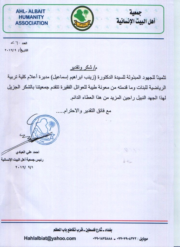 و كتاب شكر و تقدير من قبل جمعية اهل البيت الانسانية