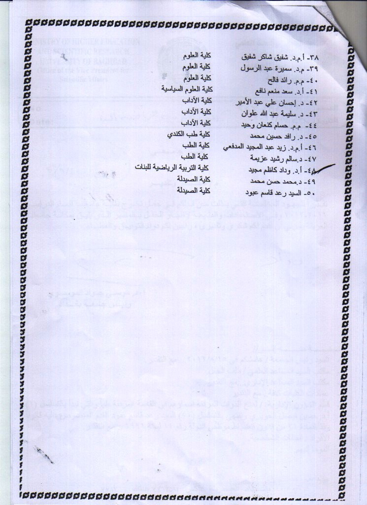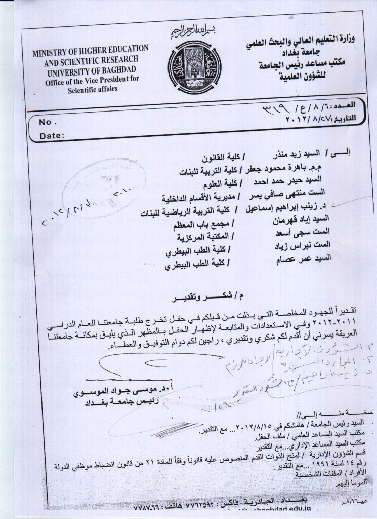 من قبل رئيس جامعة بغداد الدكتور موسى جواد الموسوي بتاريخ 27/8/2012