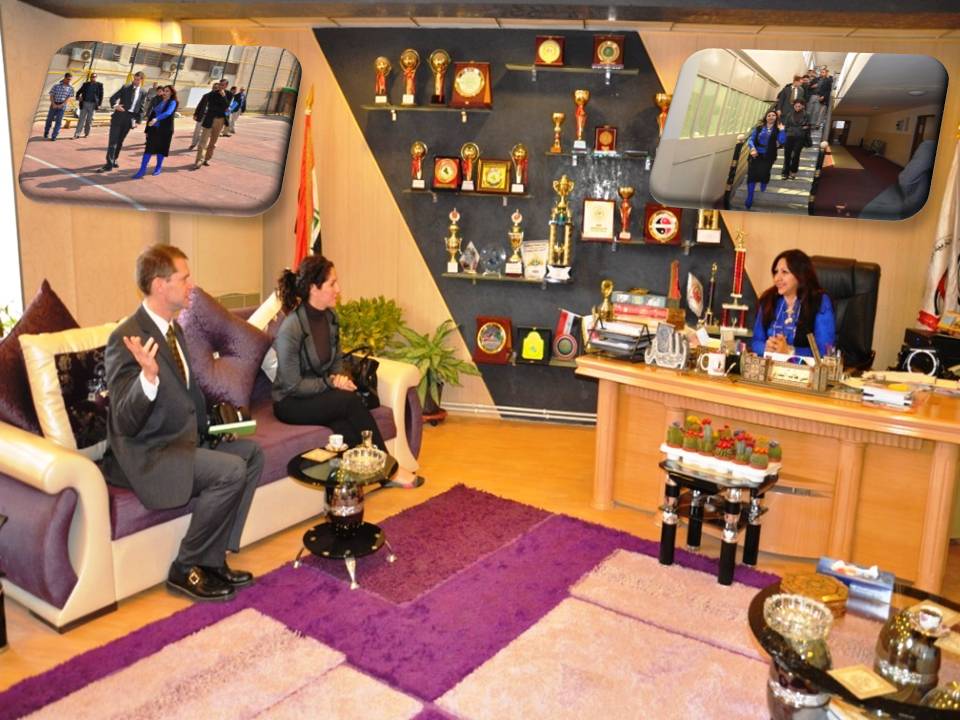 في صبيحة يوم الاثنين زار وفد امريكي من الملحقية الثقافية الامريكية في العراق المتمثل بروبرت ميركل وميساء اشهب منسقة ادارة المعلومات وكان باستقبالهم الدكتورة منى طالب عميدة الكلية وتناول اللقاء طرح العديد من المواضيع والمقترحات وسبل التعاون حيث تخلل اللقاء طلب من البدري بتزودينا بالمناهج المتطورة للكليات المناظرة و تزويدنا بقوائم المجلات العلمية ذات الافباكت فاكتر (IF) العالي لغرض استفادة التدريسيات في نشر البحوث و التعاون في استضافة مدرسين متخصصين ذوي كفاءة عالية في بعض اللعبات الفردية و الجماعية و تزويد الكلية بالكتب الحديثة و المجلات العلمية و النشرات .
