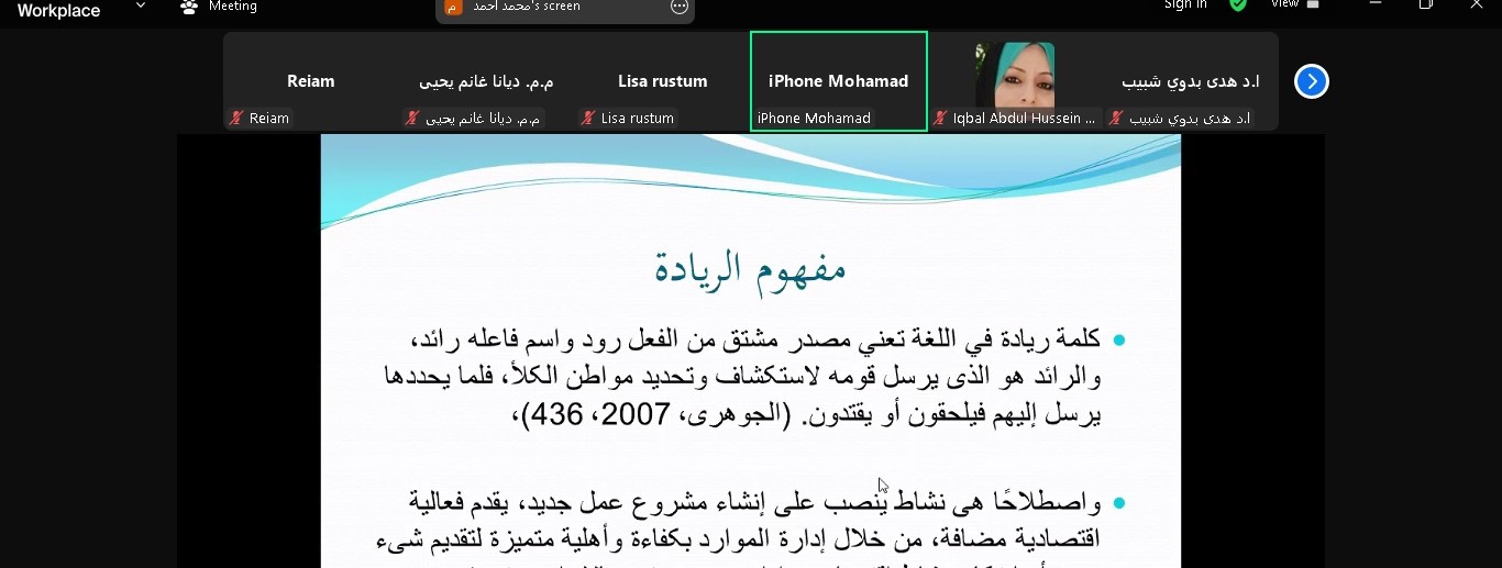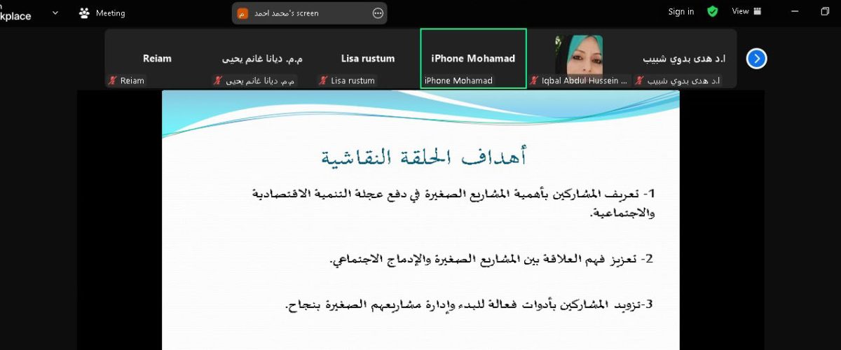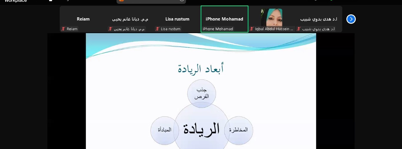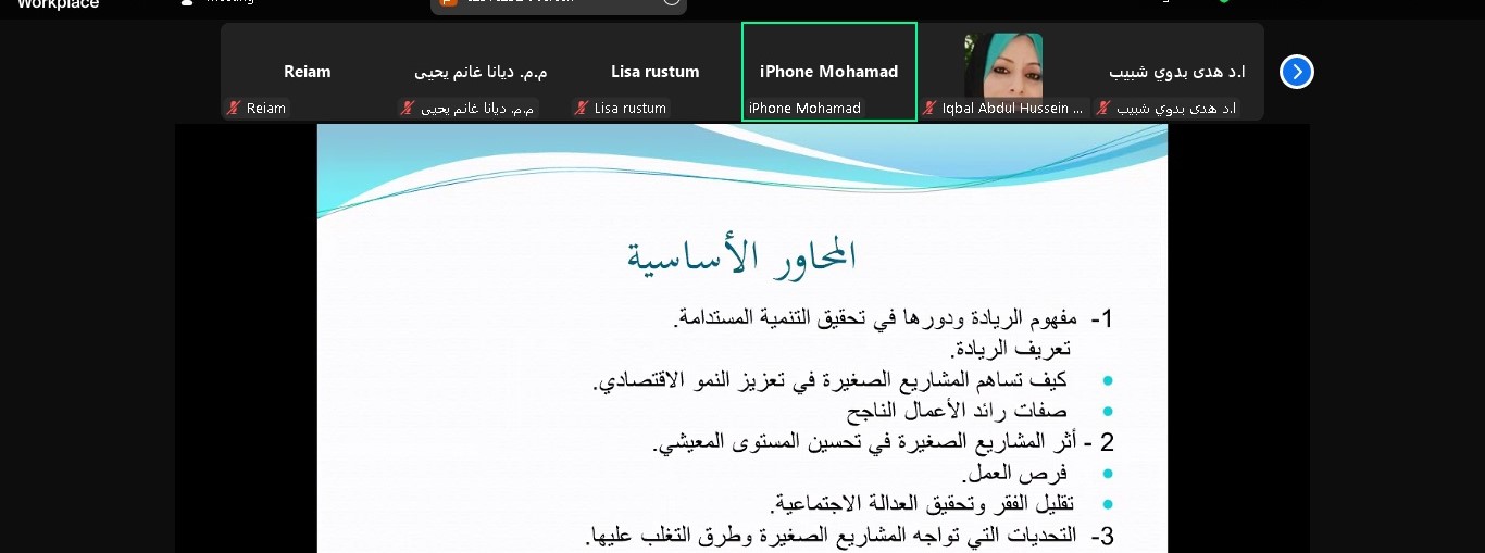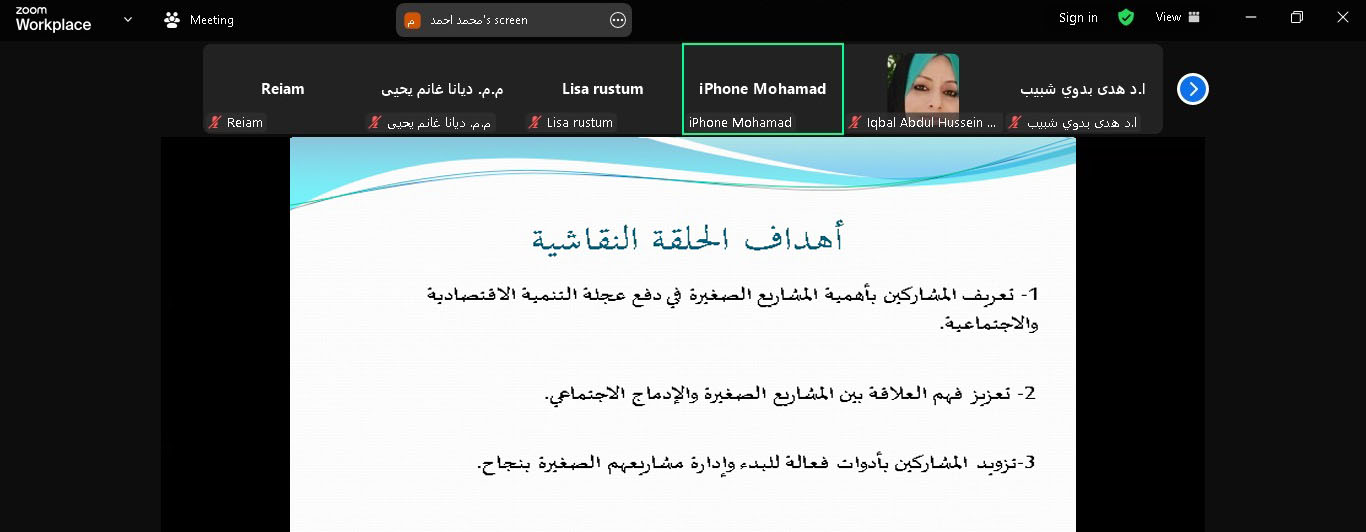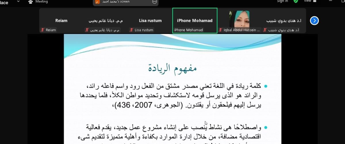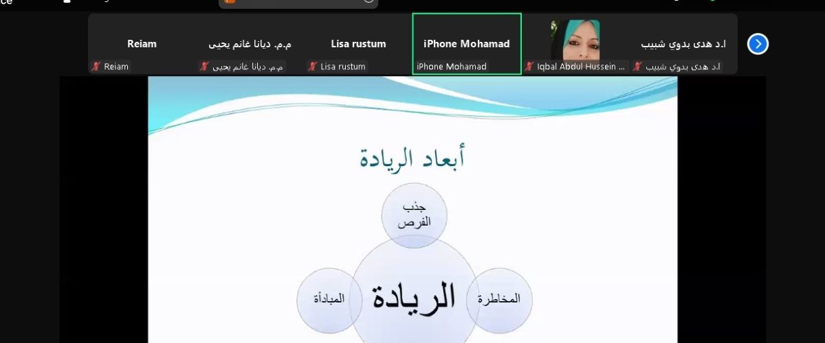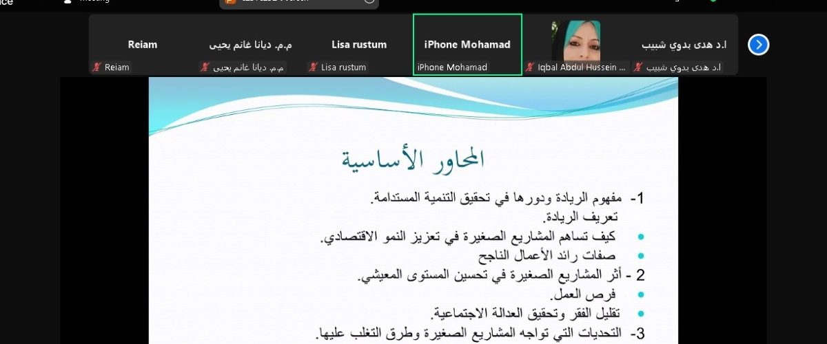 ضمن فعاليات أسبوع الريادة العالمي، نظمت وحدة الشؤون العلمية في كلية التربية البدنية وعلوم الرياضة للبنات – جامعة بغداد حلقة نقاشية إلكترونية عبر تطبيق Zoom بعنوان (تأثير المشاريع الصغيرة على تنمية المجتمع)، قدمها المدرب الدولي محمد أحمد محمود، وذلك برعاية الأستاذة الدكتورة فاطمة عبد مالح، عميد الكلية، وبإشراف م.م. ديانا غانم يحيى، مسؤولة الوحدة.