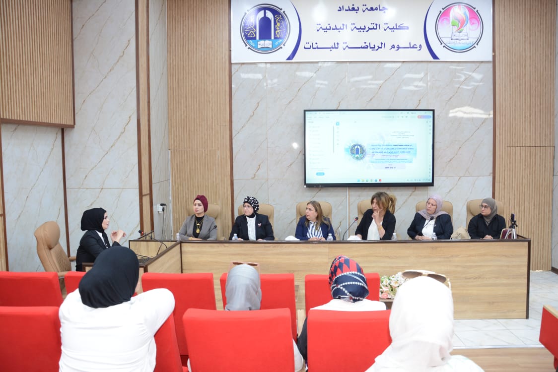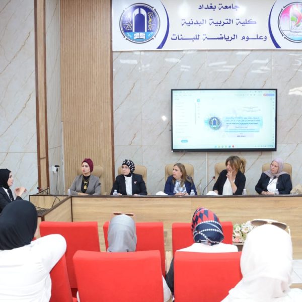 استضاف قسم الدراسات العليا في كلية التربية البدنية وعلوم الرياضة للبنات بجامعة بغداد، بأشراف ورئاسة عميدتها الأستاذة الدكتورة فاطمة عبد مالح، الممتحنة الخارجية إلكترونيًا من جامعة السلطان قابوس، الأستاذة الدكتورة هبة إبراهيم الاشقر، لمتابعة المناقشات العلمية لطالبات مرحلتي الدكتوراه والماجستير للعام الدراسي 2024-2025، كما استضافت كلا من ا.د. يسرى محمد عبد الله في جهاز الاشراف والتقويم -قسم الاعتماد والدكتورة لمى من قسم ضمان الجودة في جامعة بغداد حضوريا ،تمحورت جلسات النقاش التي عُرفت باسم (سمنار)حول مواضيع الأبحاث المقدمة، حيث تُعقد هذه الجلسات بمعدل أربع جلسات أسبوعيًا، تتألف كل جلسة من رئيس وأربعة أعضاء يقومون بمناقشة أربعة بحوث مقدمة من الطالبات، بواقع بحثين للدكتوراه وبحثين للماجستير.