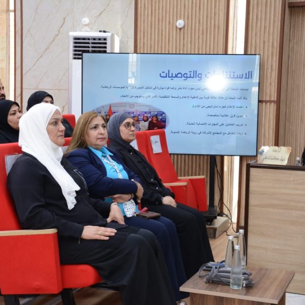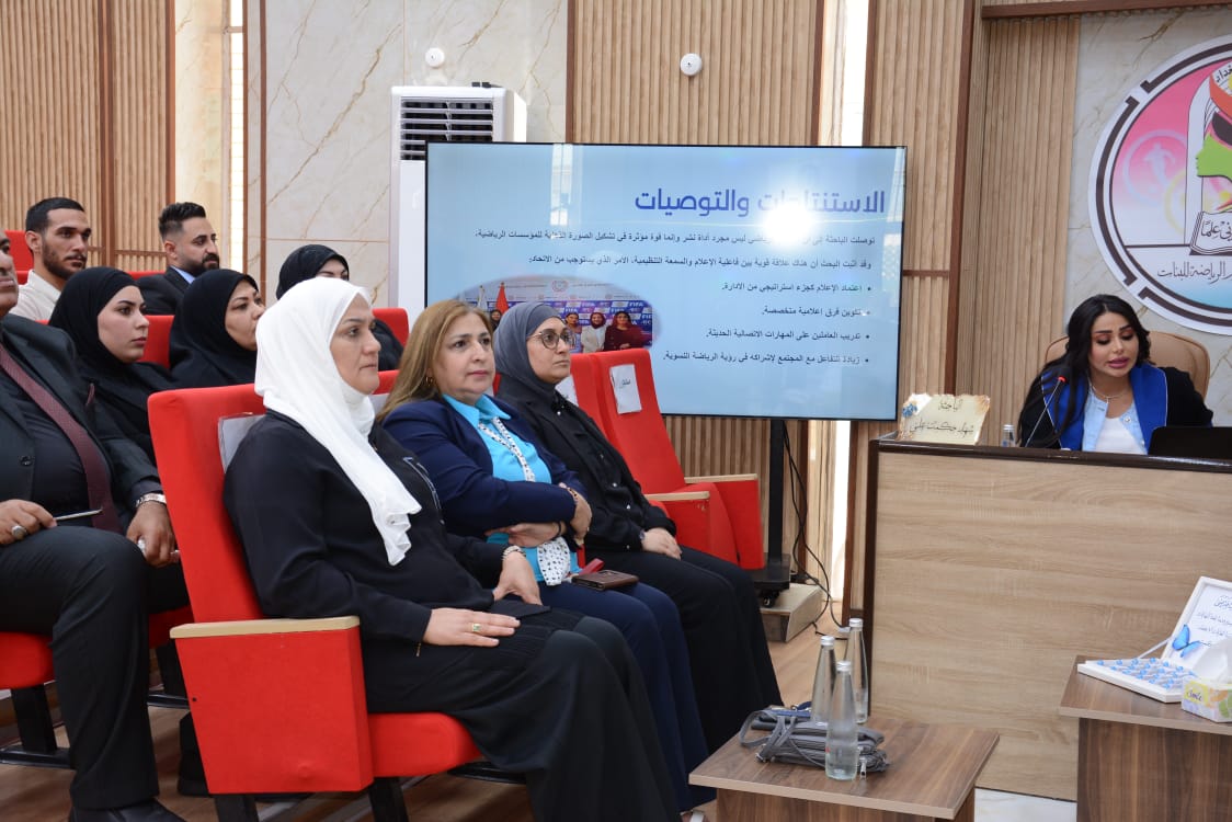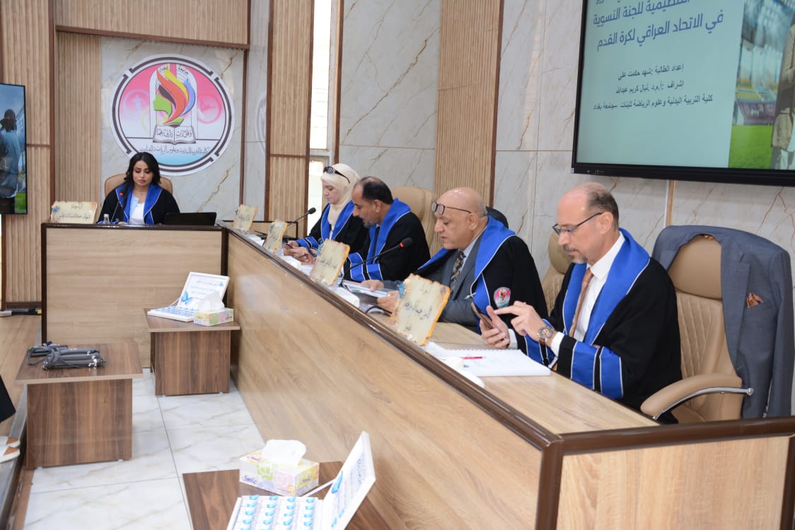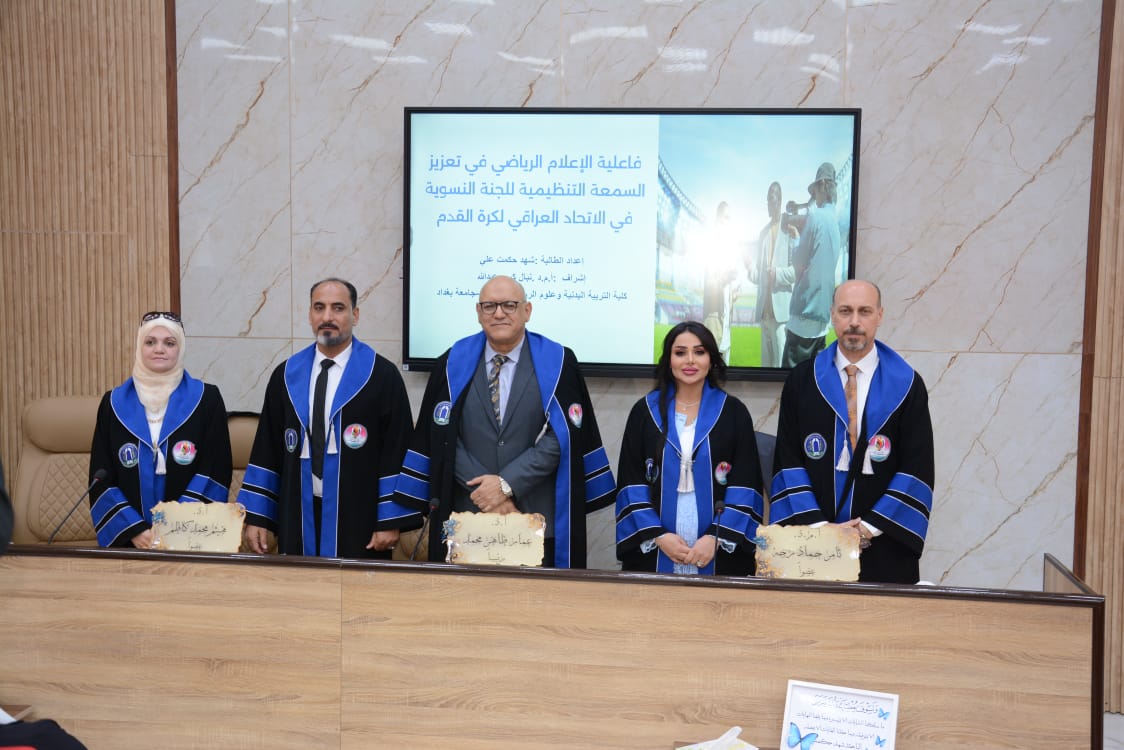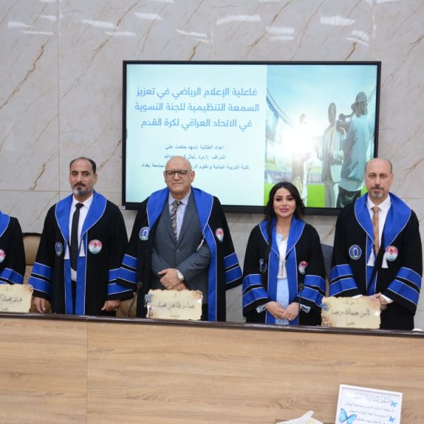 شهدت كلية التربية البدنية وعلوم الرياضة للبنات جامعة بغداد مناقشة رسالة الماجستير الموسومة (فاعلية الاعلام الرياضي في تعزيز السمعة التنظيمية للجنة النسوية في الاتحاد الع راقي لكرة القدم)، للطالبة (شهد حكمت علي).