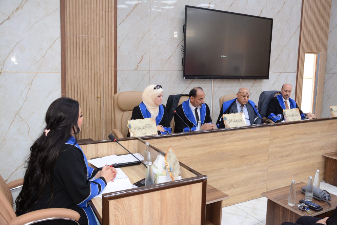 ترأس لجنة المناقشة عميد كلية الاعلام بجامعة بغداد ا.د. عمار طاهر محمد، ا.د. هيثم محمد كاظم من جامعة بابل عضوا خارجيا، ا.م.د. ثامر حماد رجه عضوا، ا.م.د. نبال كريم عبد الله مشرفا.