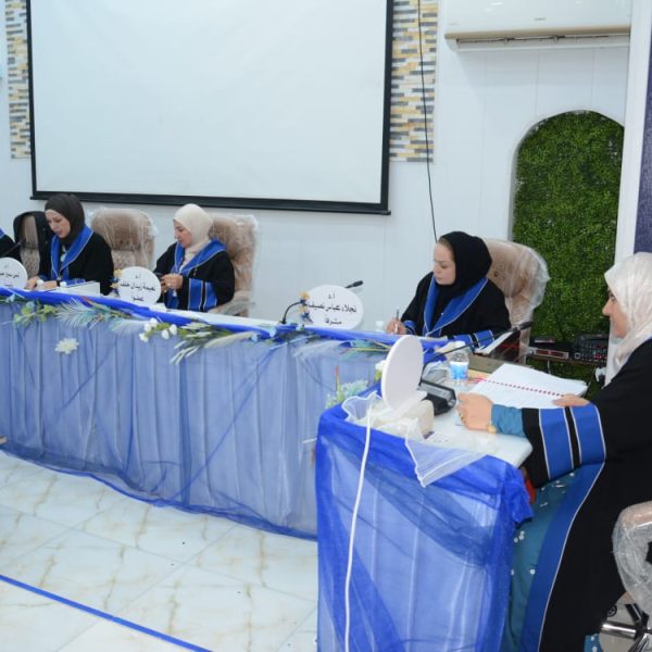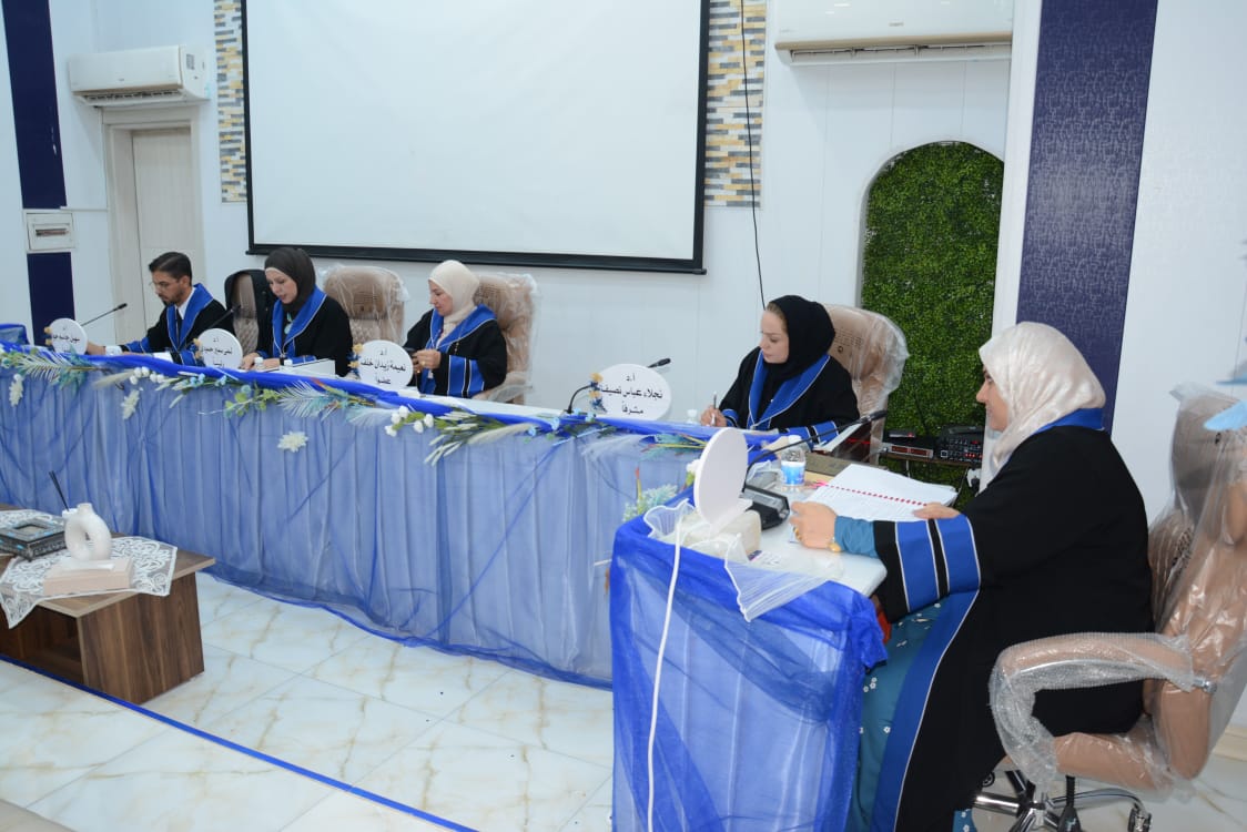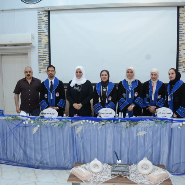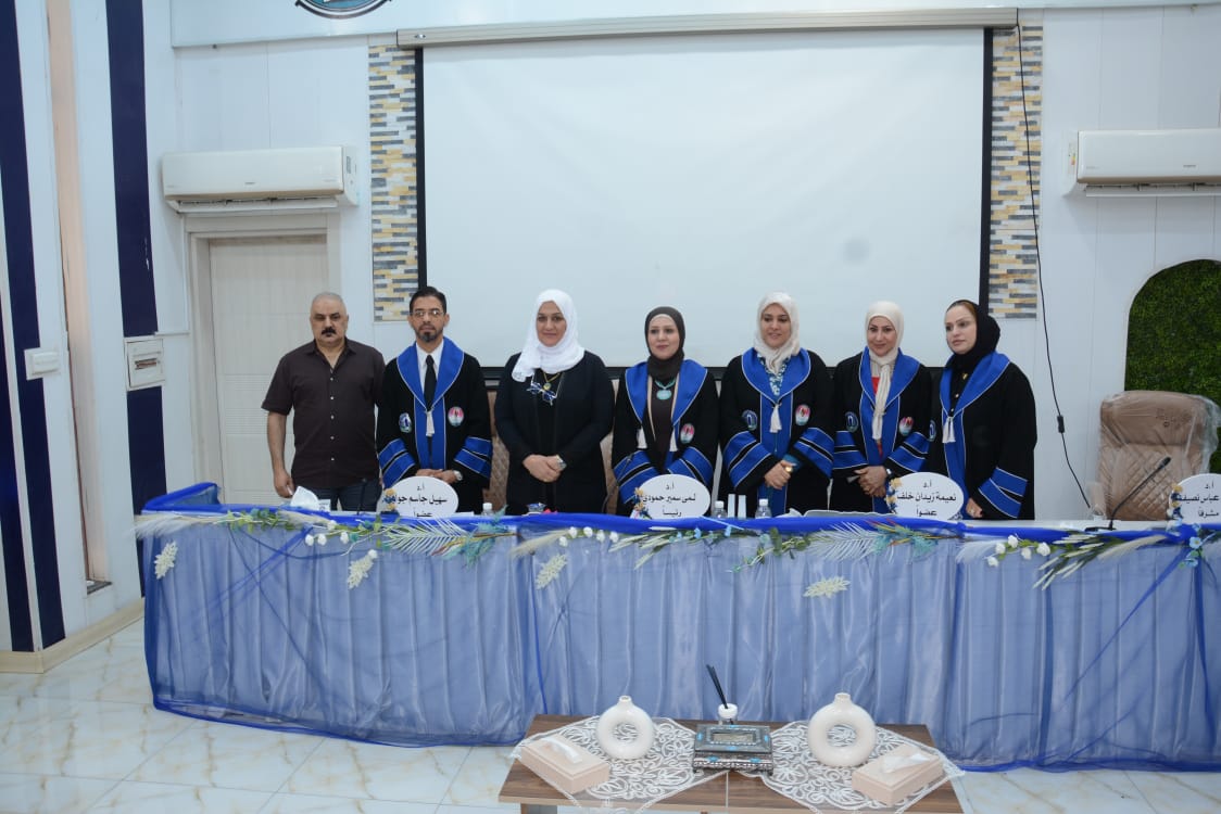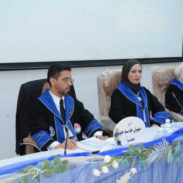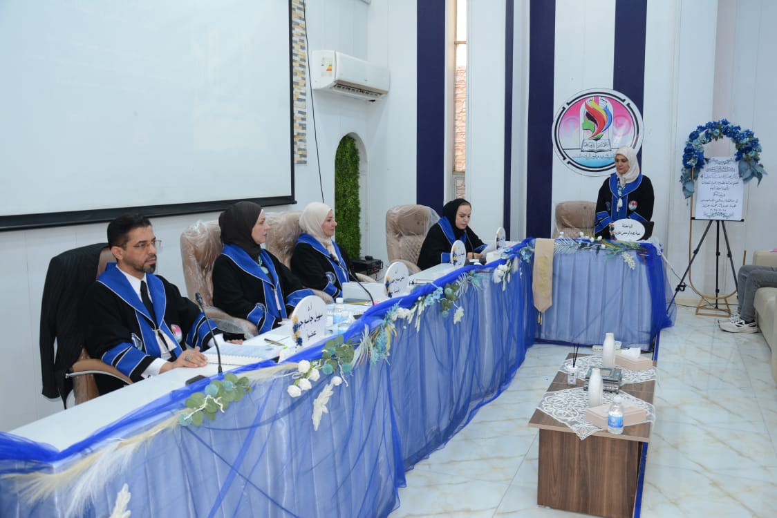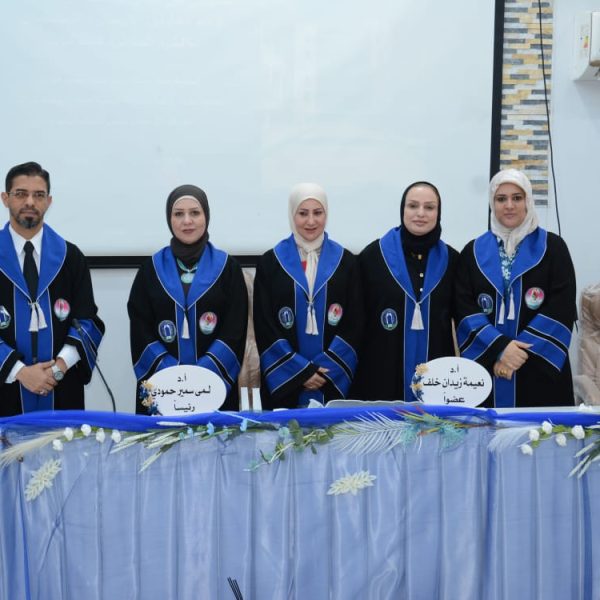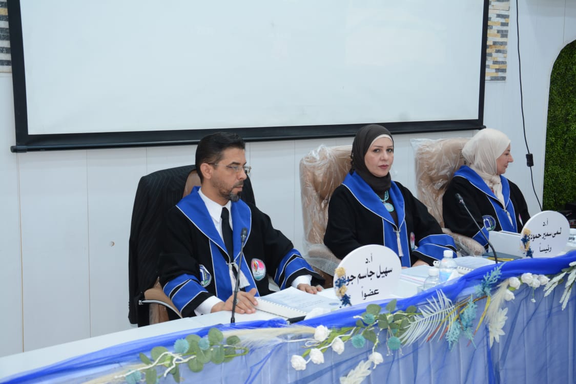 تألفت لجنة المناقشة كلا من ا.د. لمى سمير حمودي من جامعة بغداد رئيسا، ا.د. سهيل جاسم جواد من جامعة بابل عضوا خارجيا، ا.د. نعيمة زيدان خلف عضوا، ا.د. نجلاء عباس نصيف مشرف.