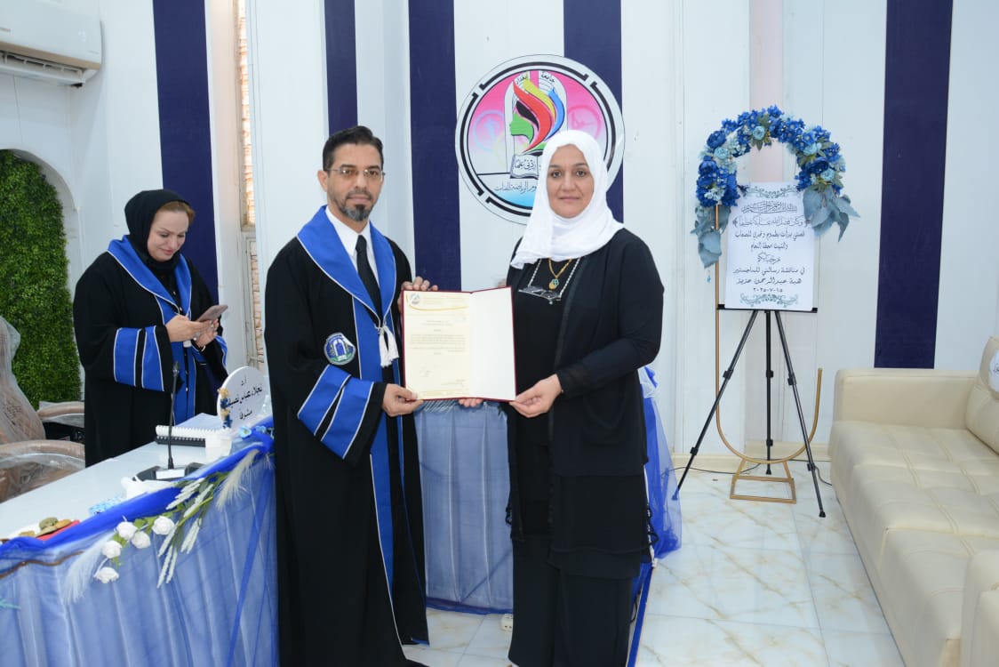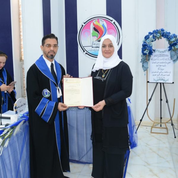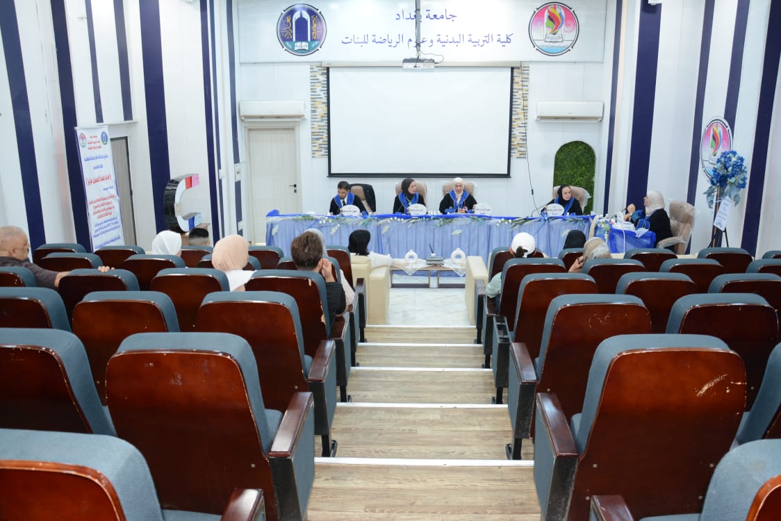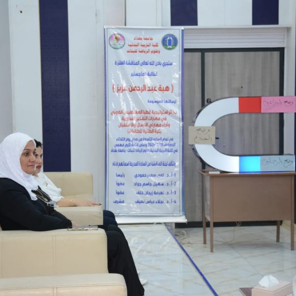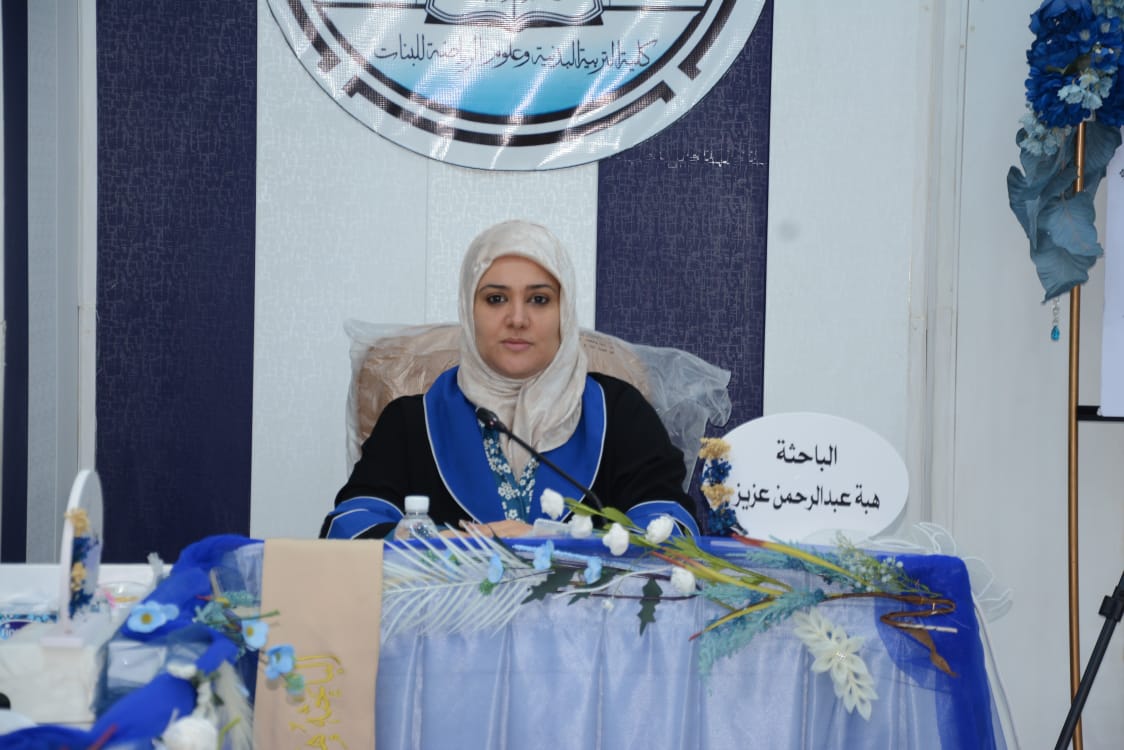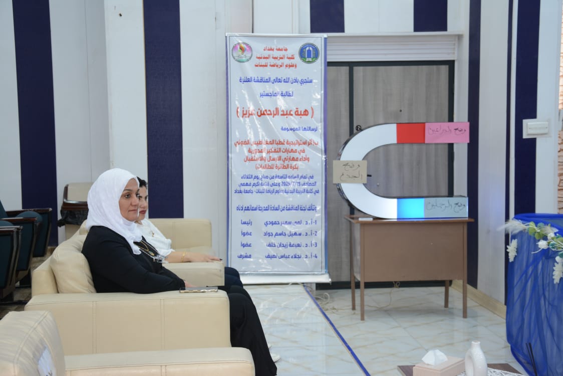 شهدت كلية التربية البدنية وعلوم الرياضة للبنات جامعة بغداد مناقشة رسالة الماجستير الموسومة (إثر استراتيجية قطبا المغناطيس الضوئي في مهارات التفكير المحورية واداء مهارتي الارسال والاستقبال بالكرة الطائرة للطالبات)، للطالبة (هبة عبد الرحمن عزيز).