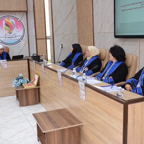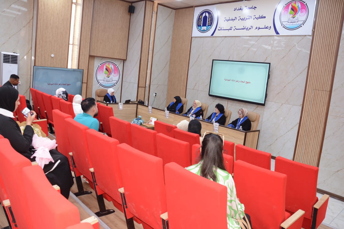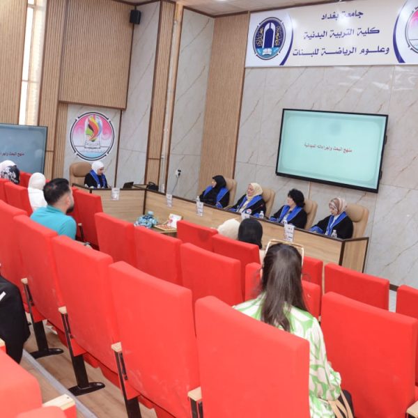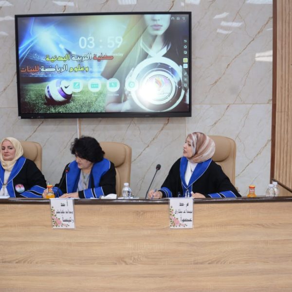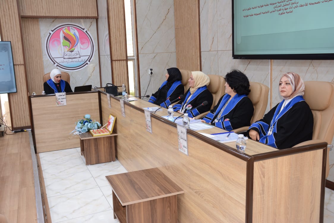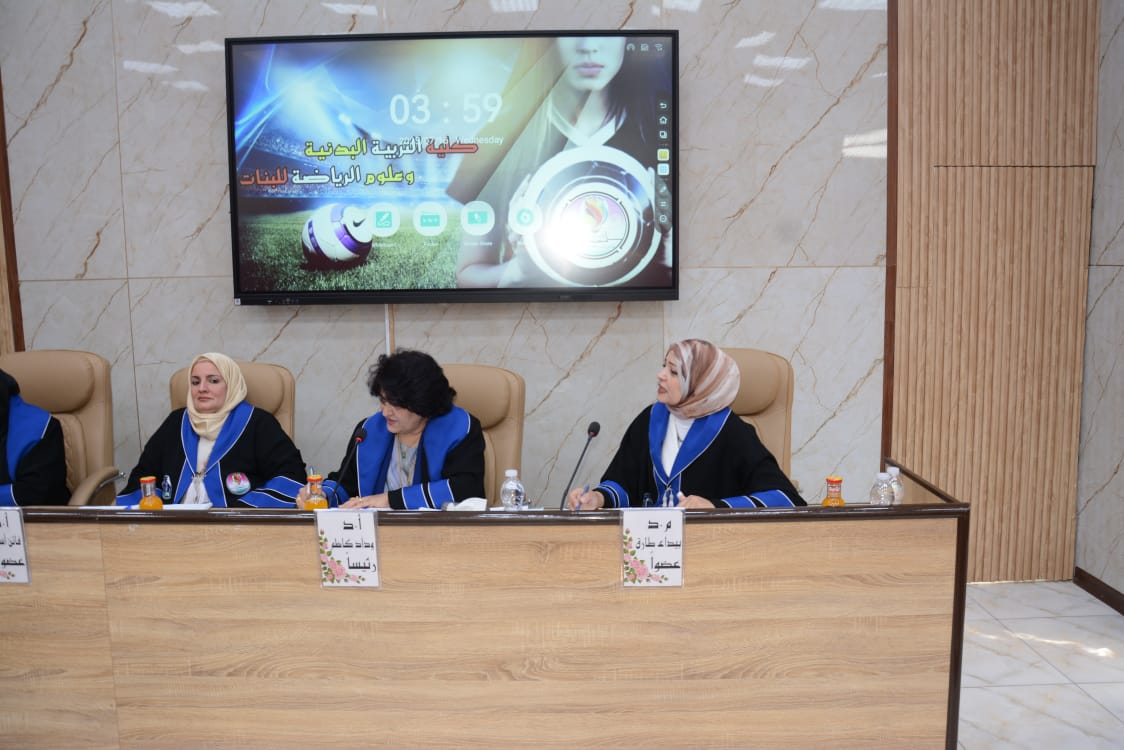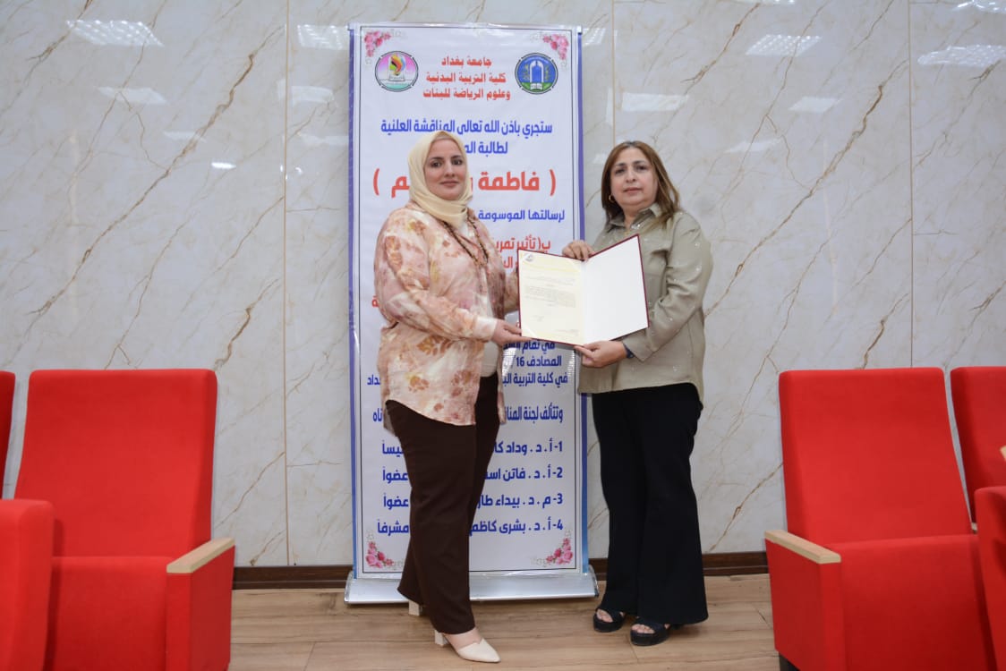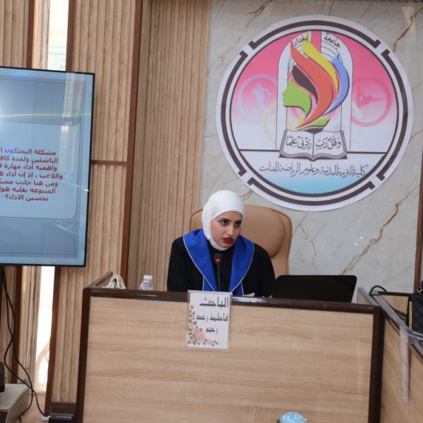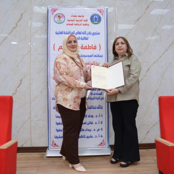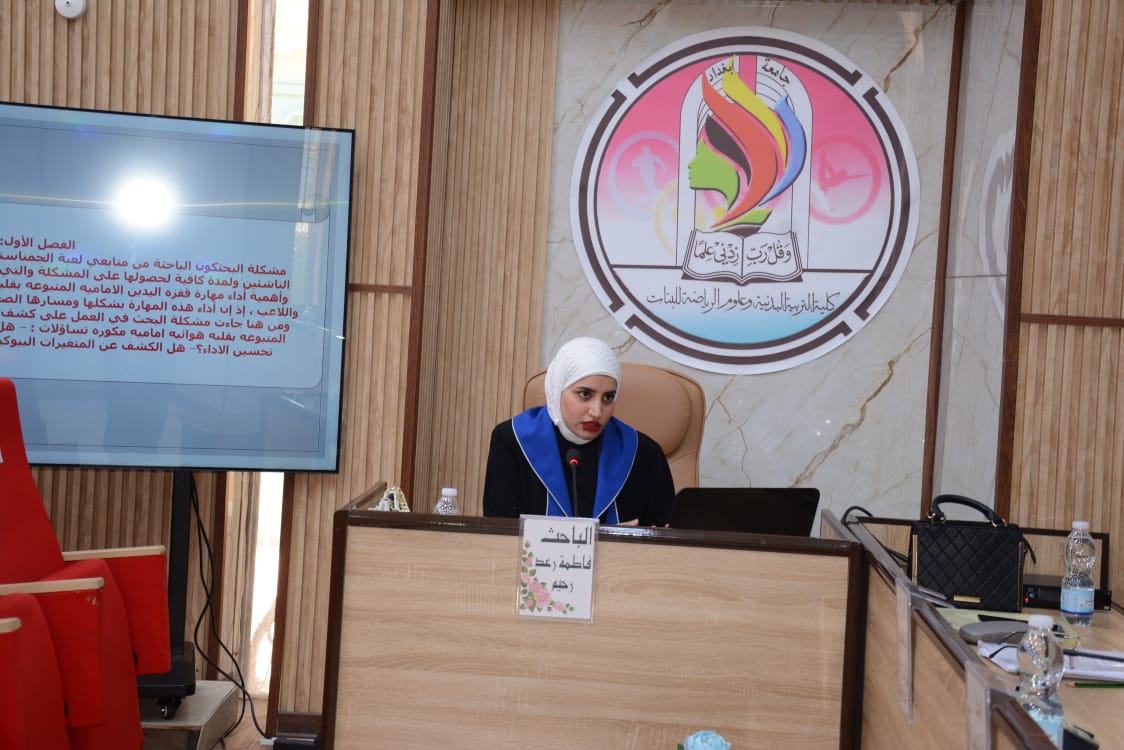 شهدت كلية التربية البدنية وعلوم الرياضة للبنات جامعة بغداد مناقشة رسالة الماجستير الموسومة (تأثير تمرينات تصحيحية على بعض المتغيرات البايوكينماتيكية واداء مهارة قفزة اليدين المتبوعة بقلبة هوائية امامية مكورة على بساط الحركات الارضية لفئة الناشئين)، للطالبة (فاطمة رعد رحيم).