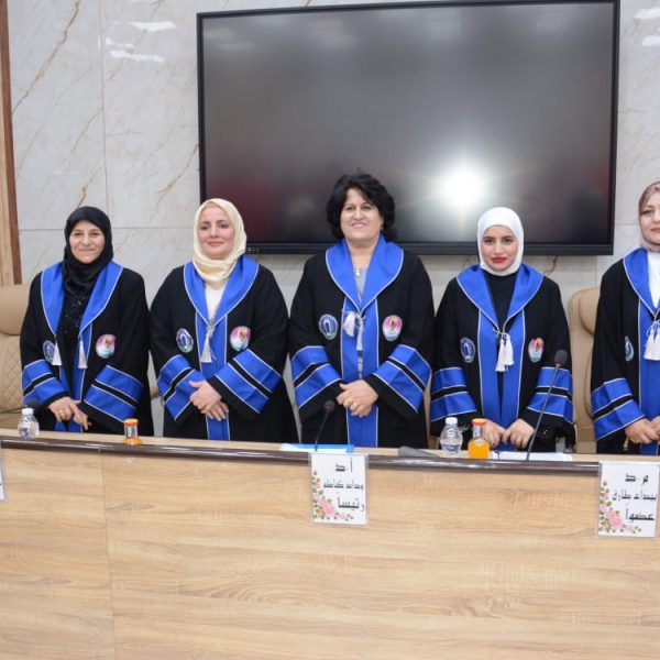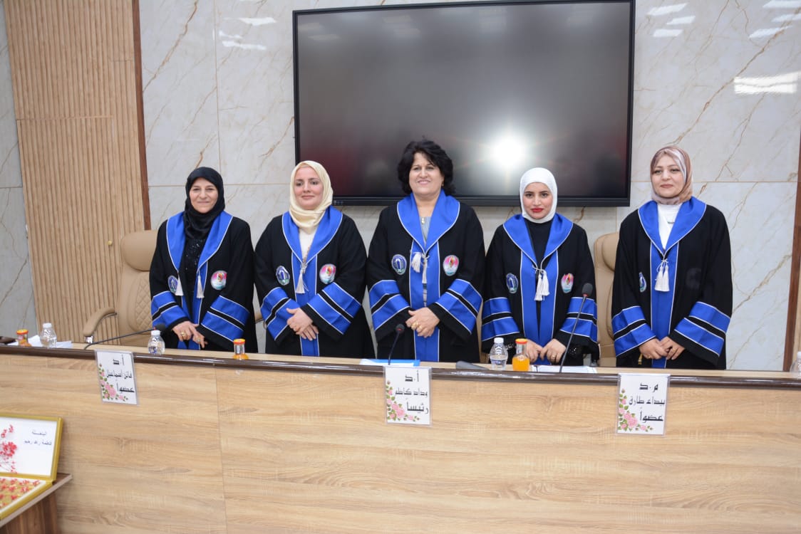 تألفت لجنة المناقشة كلا من ا.د. وداد كاظم مجيد من جامعة بغداد رئيسا، ا.د. فاتن اسماعيل محمد من الجامعة المستنصرية عضوا خارجيا، م.د. بيداء طارق عبد الواحد عضوا، ا.د. بشرى كاظم عبد الرضا مشرفا.