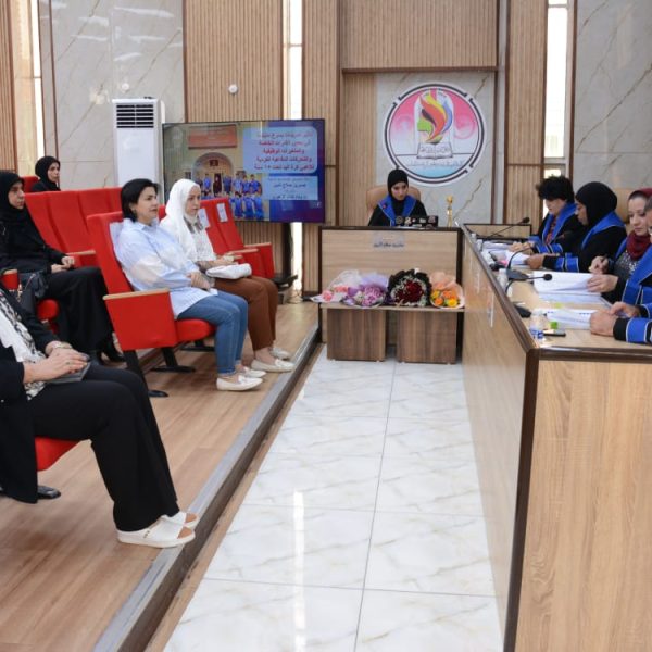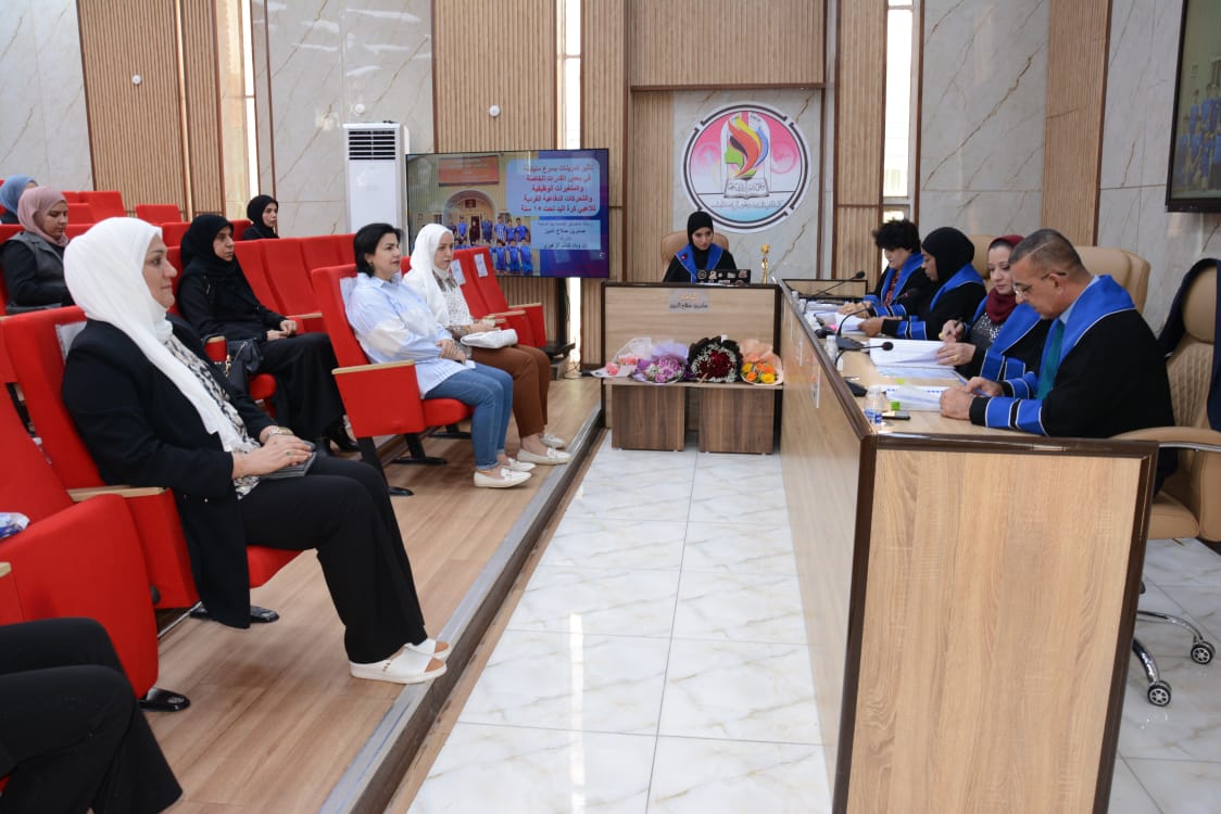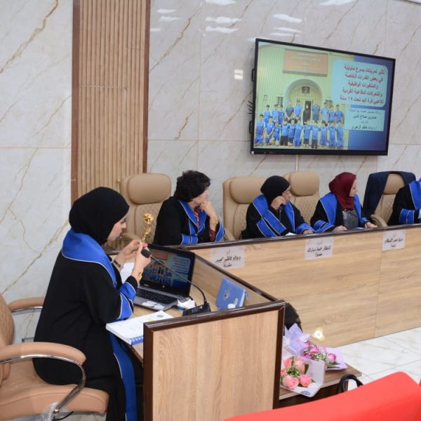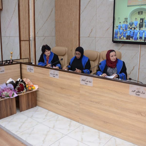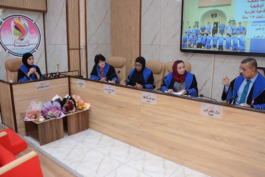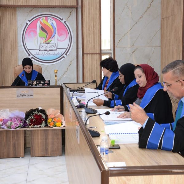 تألفت لجنة المناقشة كلا من ا.د.ندى عبد السلام صبري من جامعة بغداد رئيسا ، ا.م.د.انتظار جمعة مبارك عضوا، ا.م.د.نزار ناظم حميد من جامعة ديالى عضوا خارجيا ، ا.د. وداد كاظم مجيد مشرفا .