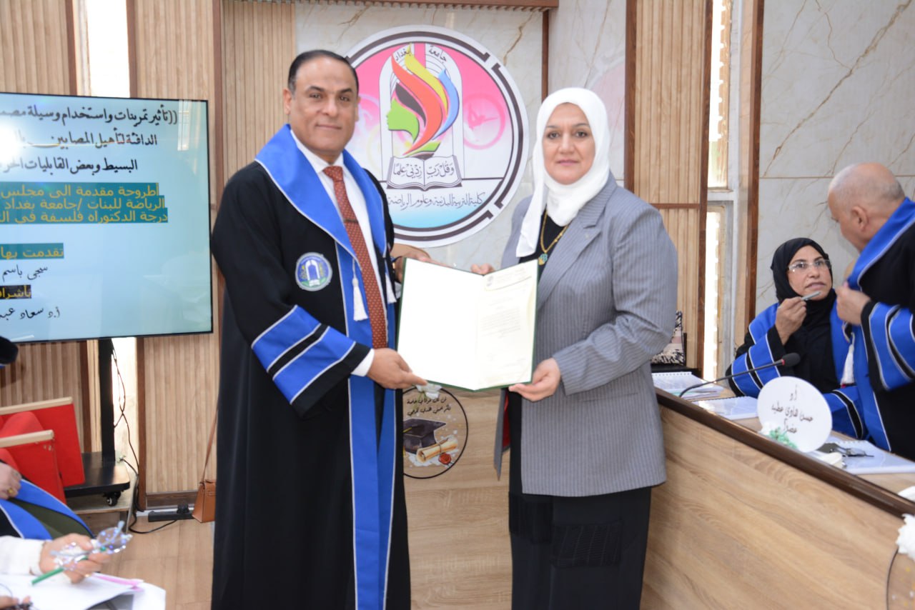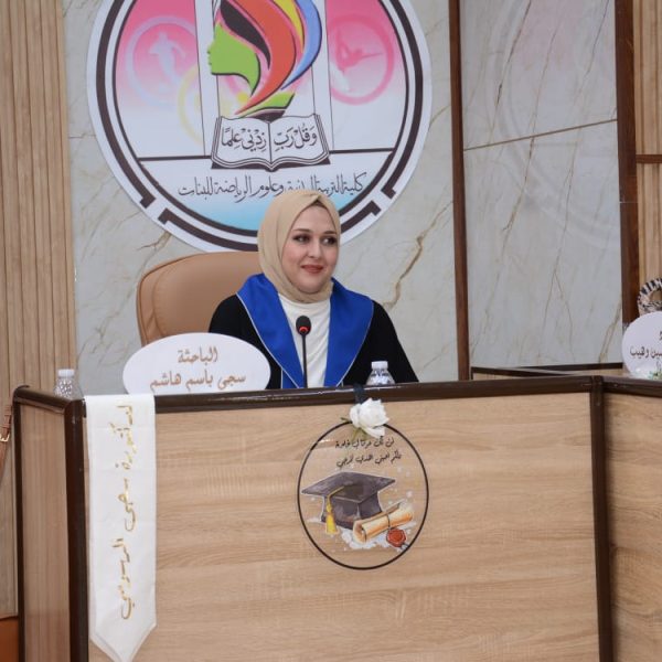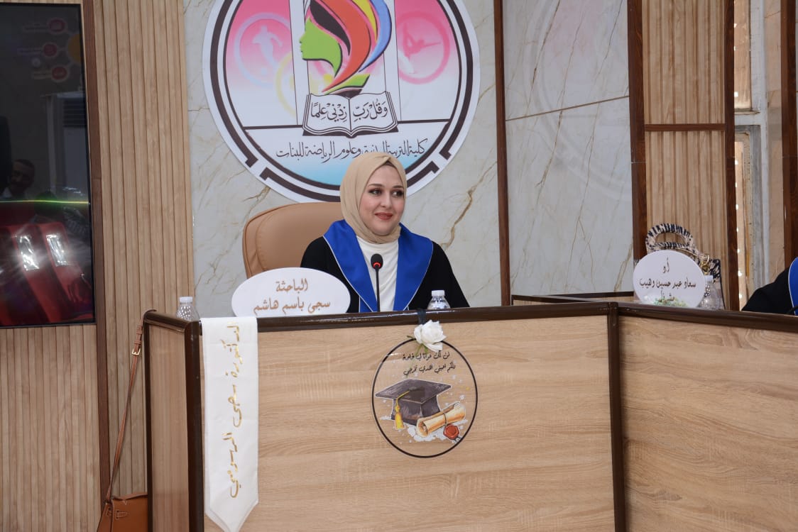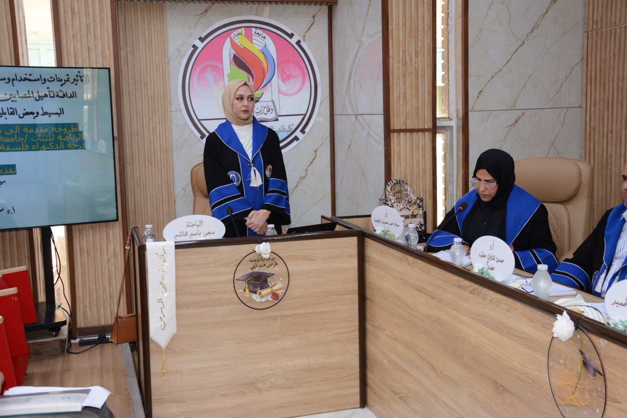نوقشت في كلية التربية البدنية وعلوم الرياضة للبنات جامعة بغداد اطروحة الدكتوراه الموسومة (تأثير تمرينات واستخدام وسيلة مصممة للمشي على الرمال الدافئة لتأهيل المصابين بالشلل الدماغي التشنجي البسيط وبعض القابليات الحركية للاعمار (6-8) سنوات)، للطالبة (سجى باسم هاشم).