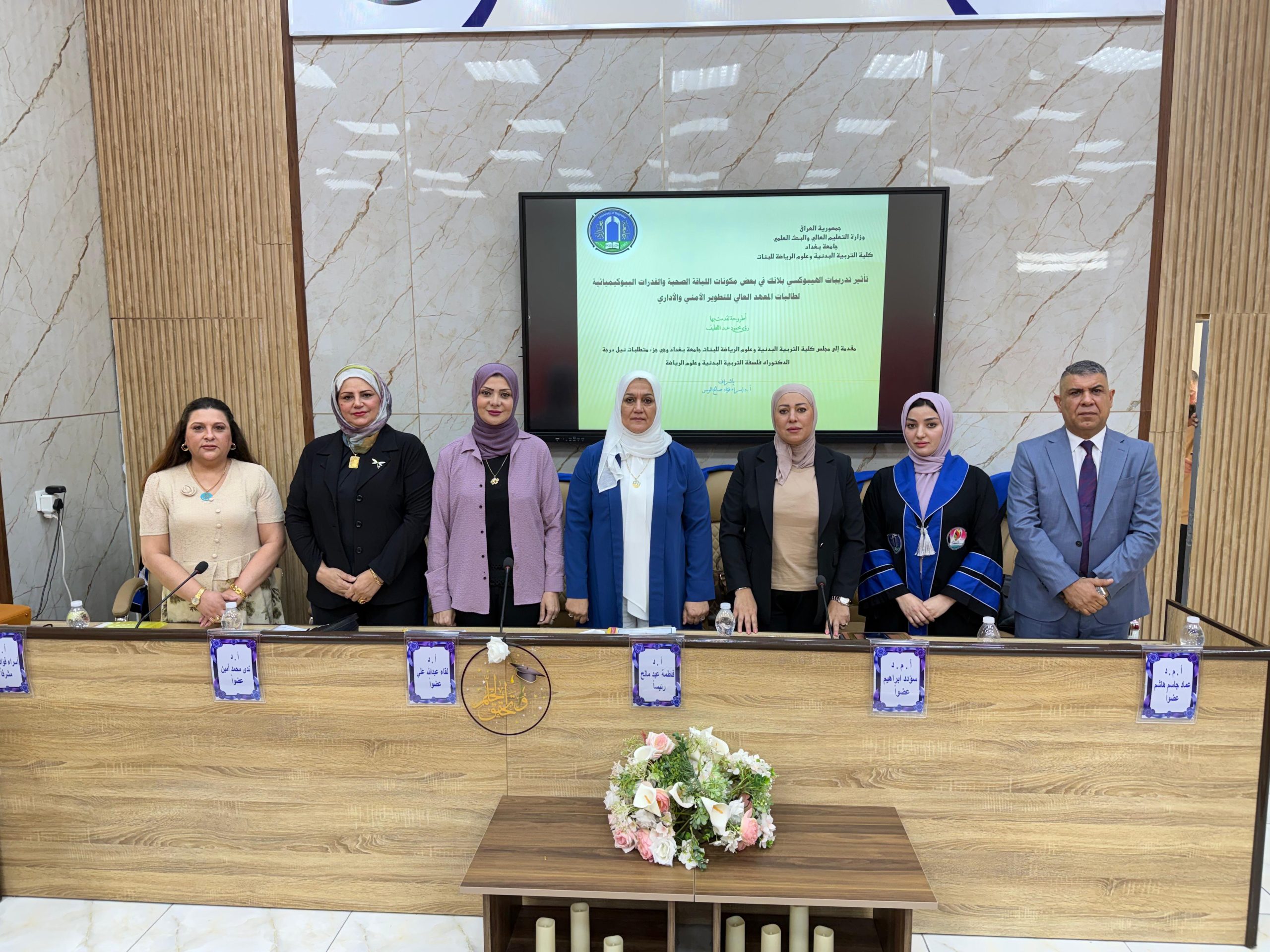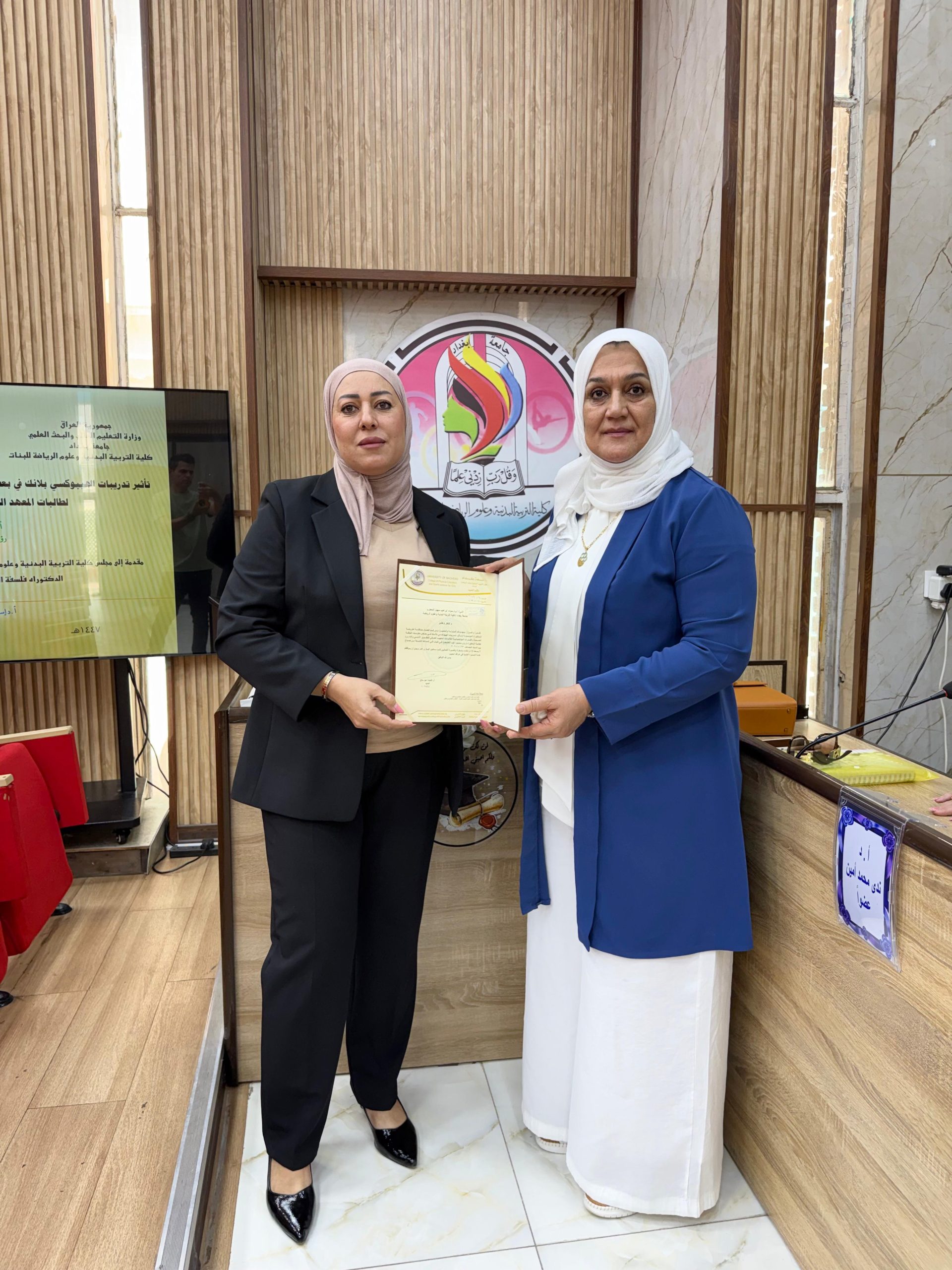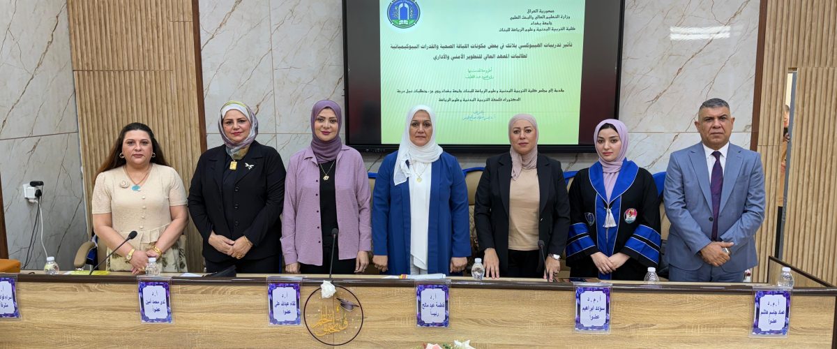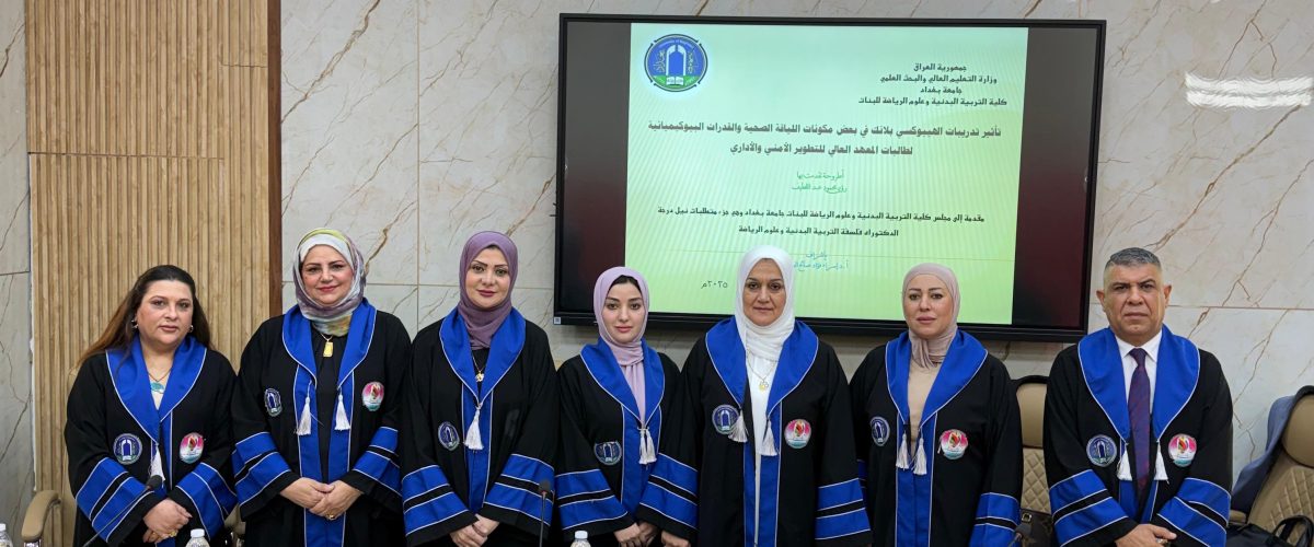 ترأست عميدة كلية التربية البدنية وعلوم الرياضة للبنات جامعة بغداد الاستاذ الدكتور فاطمة عبد مالح عضوية لجنة مناقشة اطروحة الدكتوراه الموسومة (تأثير تدريبات الهيبوكسي بلانك في بعض مكونات اللياقة الصحية والقدرات البيوكيميائية لطالبات المعهد العالي للتطوير الامني والاداري ) , للطالبة (رؤى محمود عبد اللطيف) .