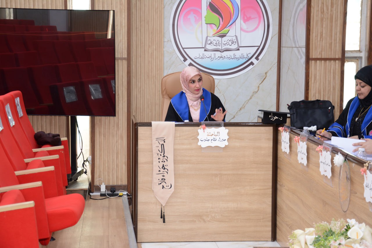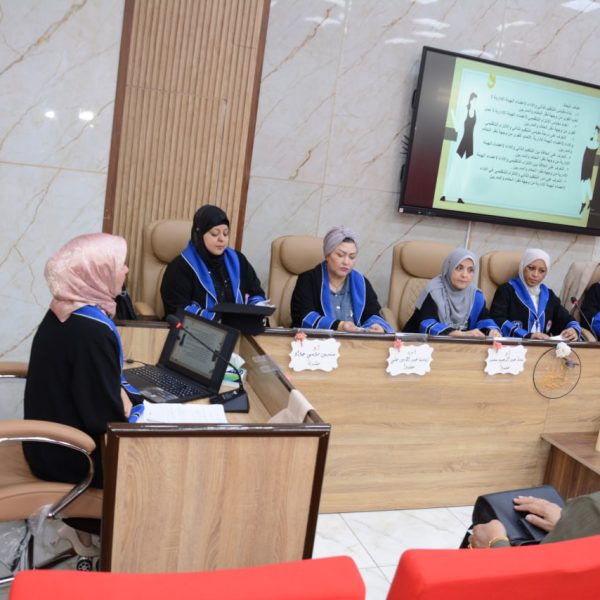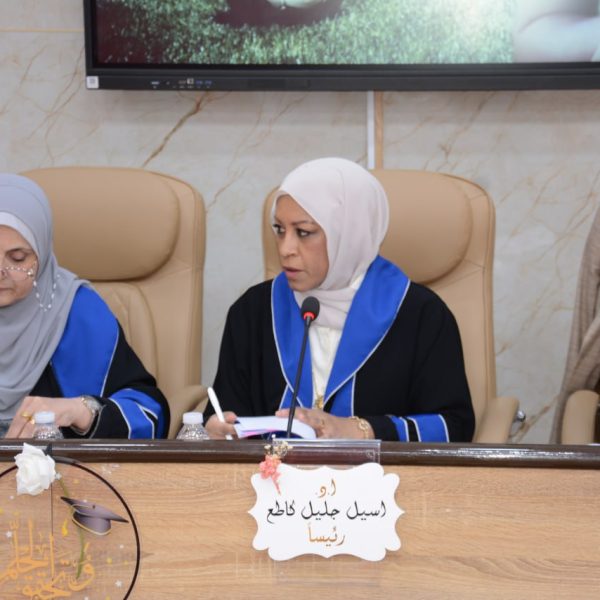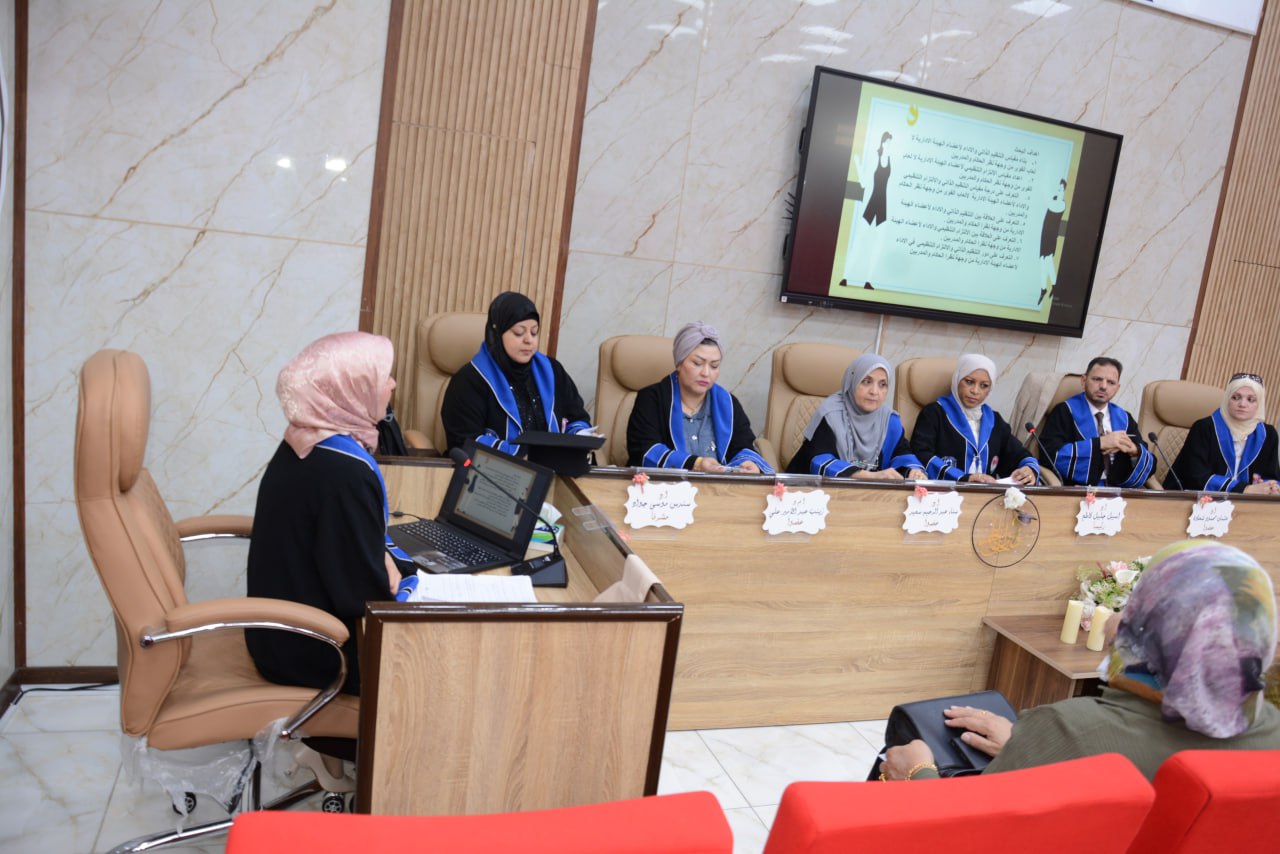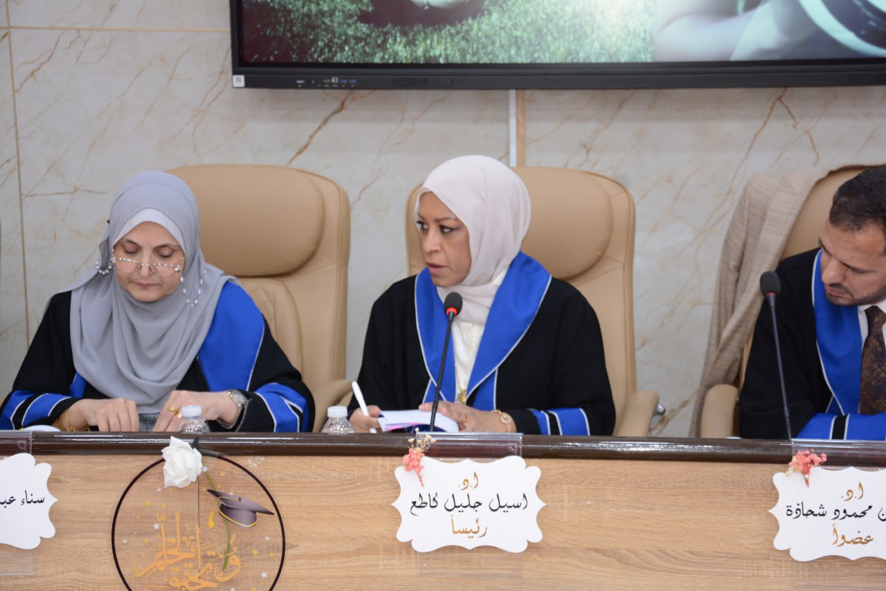 تألفت لجنة المناقشة كلا من ا.د.اسيل جليل كاطع من جامعة بغداد رئيسا , ا.د.سناء عبد الرحيم سعيد عضوا ,ا.د.عثمان محمود شحاذة من جامعة ديالى عضوا خارجيا ,ا.م.د.زينب علي عبد الامير عضوا ,ا.م.د.نبال كريم عبد الله عضوا ,ا.د. سندس موسى جواد مشرفا .