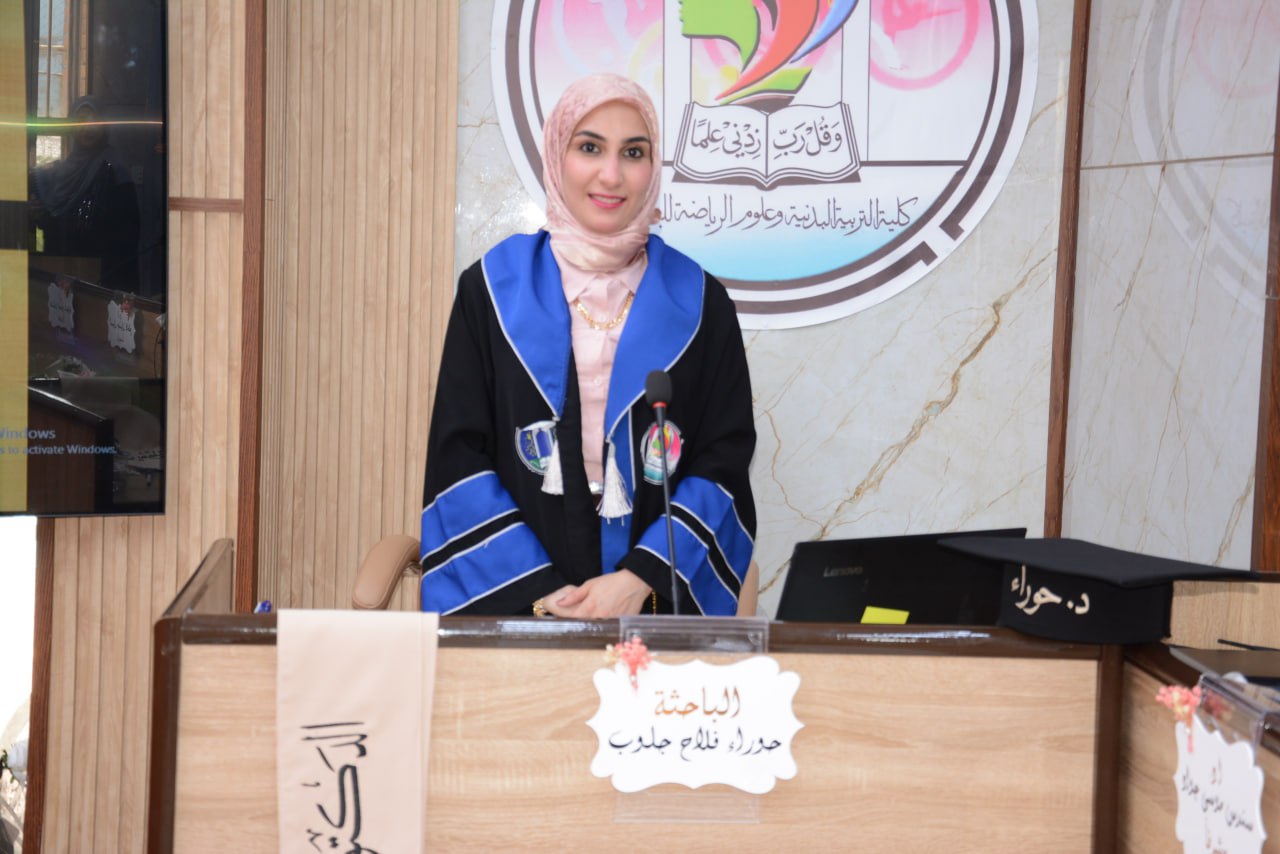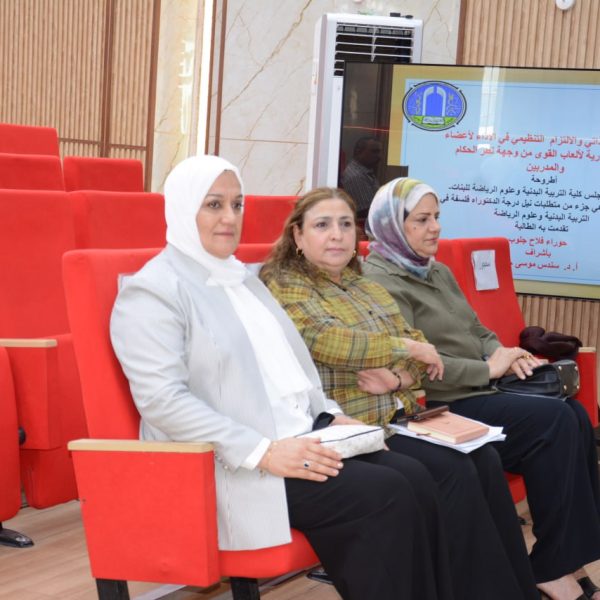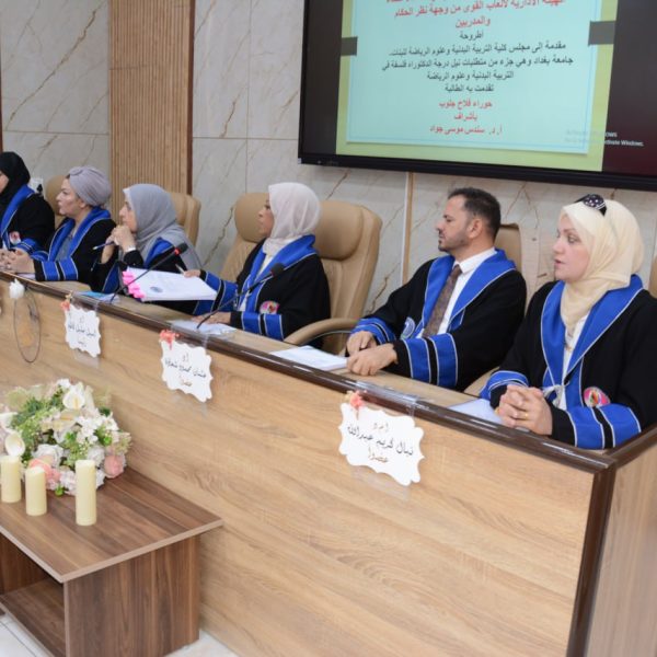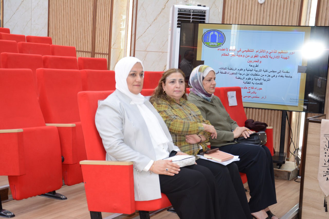 نوقشت في كلية التربية البدنية وعلوم الرياضة للبنات جامعة بغداد اطروحة الدكتوراه الموسومة (دور التنظيم الذاتي والالتزام التنظيمي لاعضاء الهيئة الادارية لالعاب القوى من وجهة نظر الحكام والمدربين) , للطالبة (حوراء فلاح جلوب) .