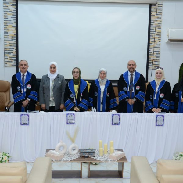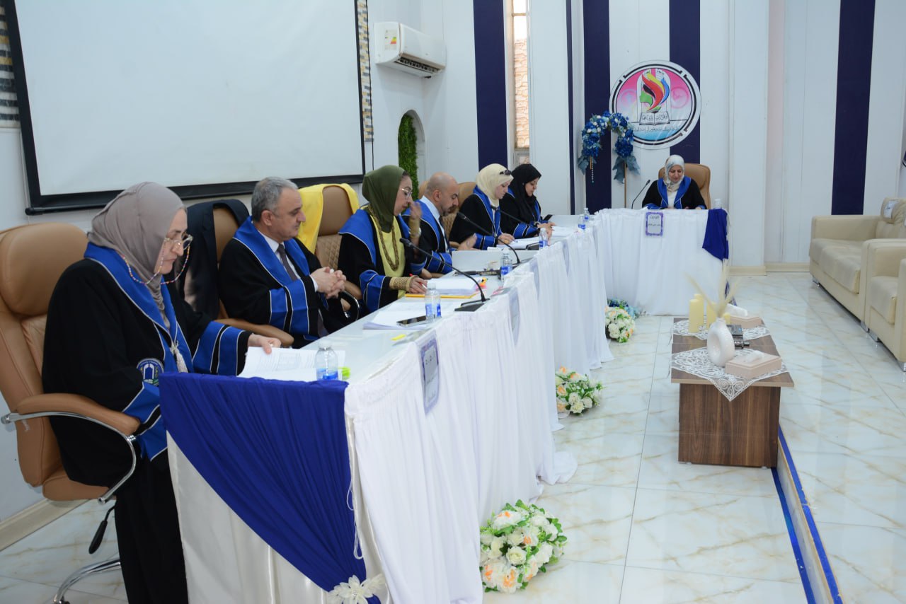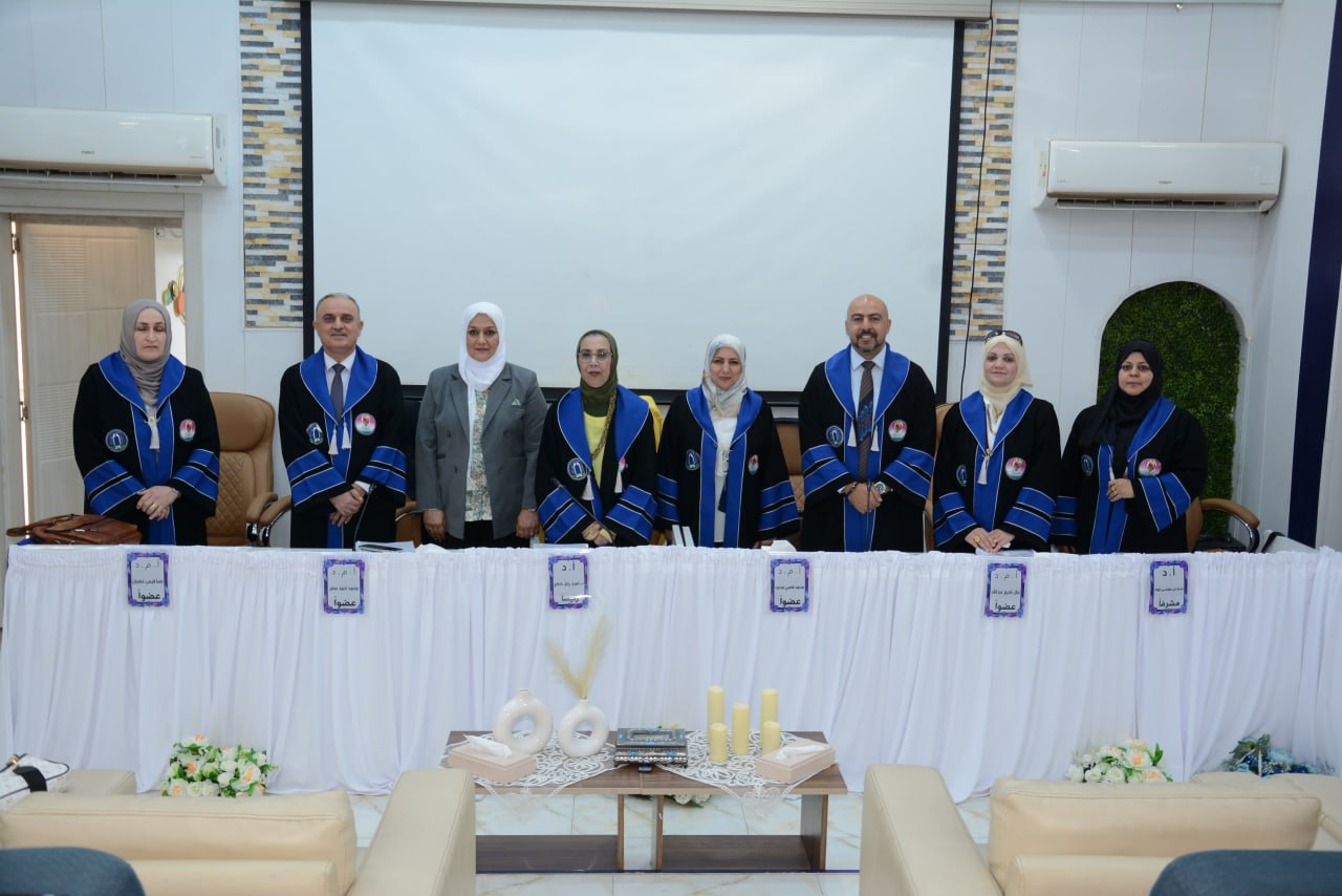 تألفت لجنة المناقشة كلا من ا.د.ساهرة رزاق كاظم من جامعة بغداد رئيسا، ا.م.د.محمد احمد صابر من جامعة كركوك عضوا خارجيا، ا.م.د.محمد قصي محمد عضوا، ا.م.د.صبا قيس غضبان عضوا، ا.م.د.نبال كريم عبد الله عضوا، ا.د.سندس موسى جواد مشرفا.