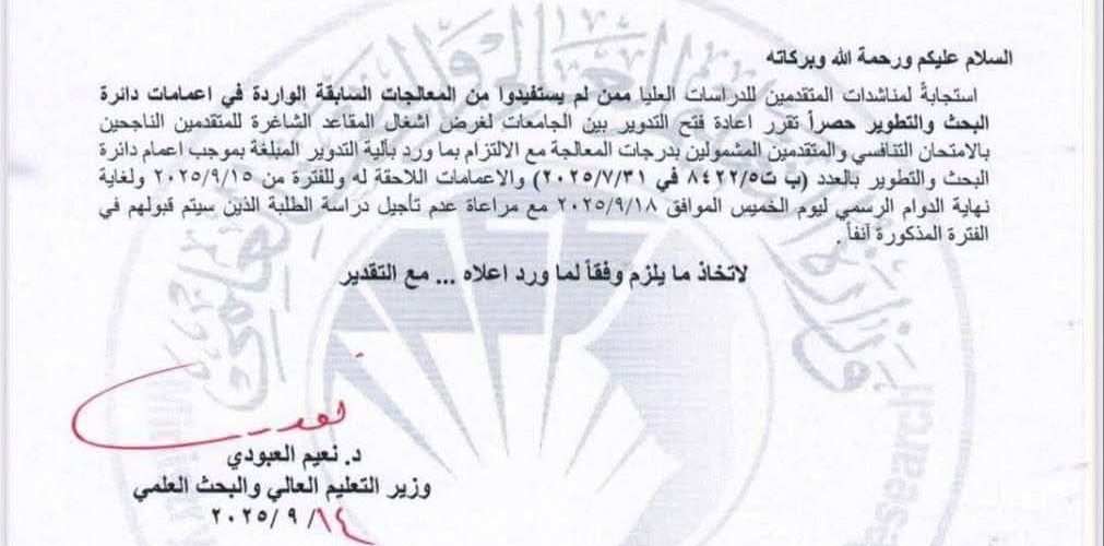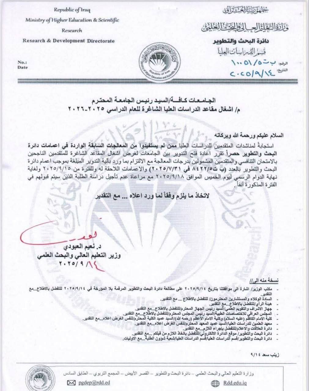 استنادا الى كتاب وزارة التعليم العالي والبحث العلمي ذي العدد: ب ت5/10051 في 14/9/2025 القاضي بإعادة فتح التدوير بين الجامعات لغرض اشغال المقاعد الشاغرة للمتقدمين الناجحين بالامتحان التنافسي والمتقدمين المشمولين بدرجات المعالجة تعلن شعبة شؤون الدراسات العليا في كلية التربية البدنية وعلوم الرياضة للبنات / جامعة بغداد عن المقاعد الشاغرة والبالغ عددها (5) خمسة مقاعد لمرحلة الدكتوراه (فقط) على النفقة الخاصة، وعلى الراغبات بالتدوير مراجعة الكلية اعتبارا من 15/9/2025 لغاية نهاية الدوام الرسمي ليوم الخميس الموافق 18/9/2025