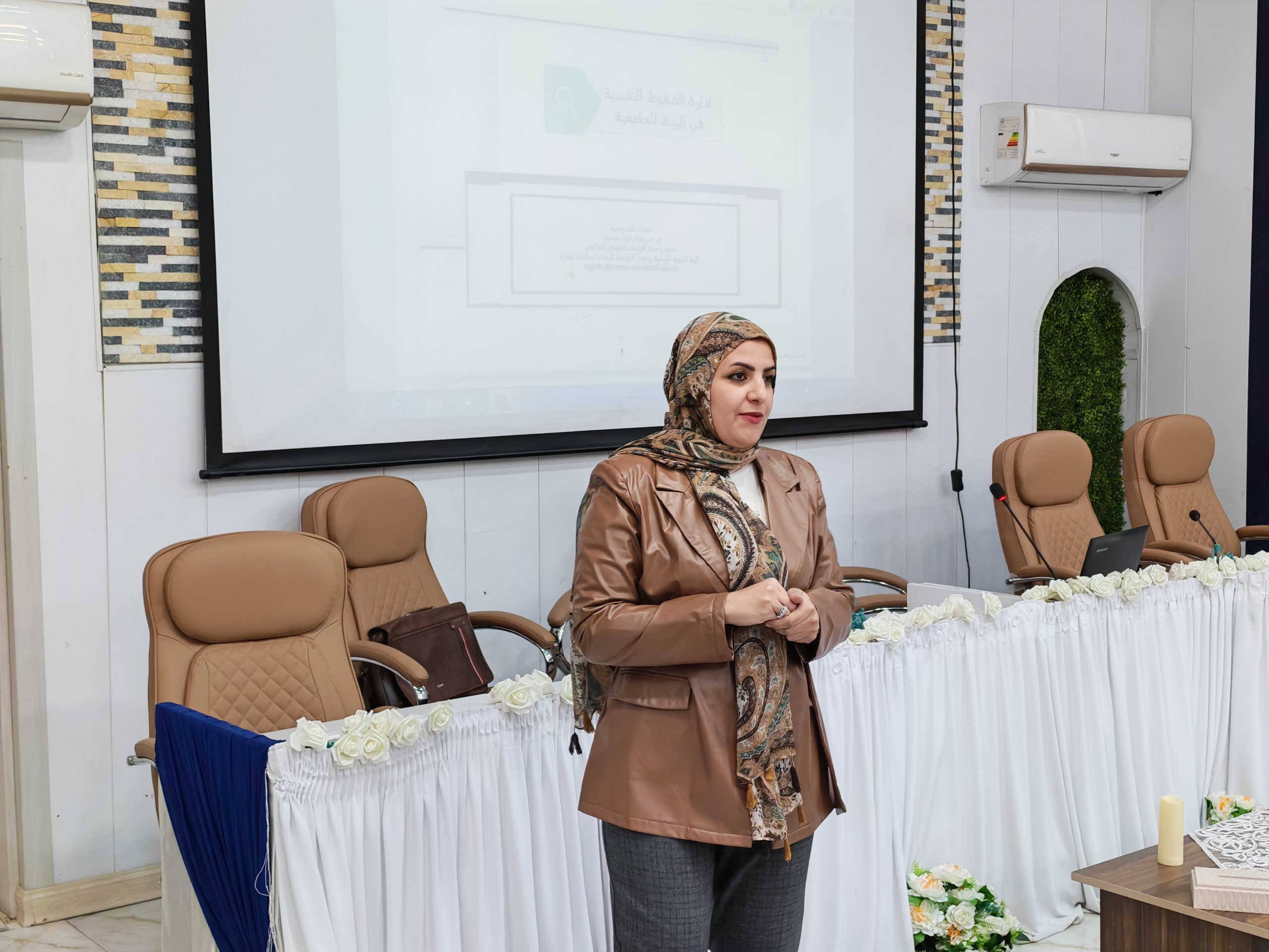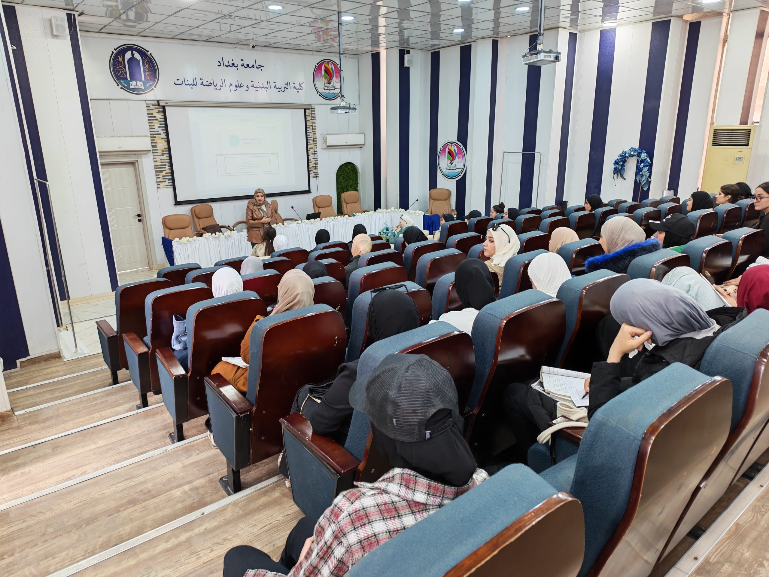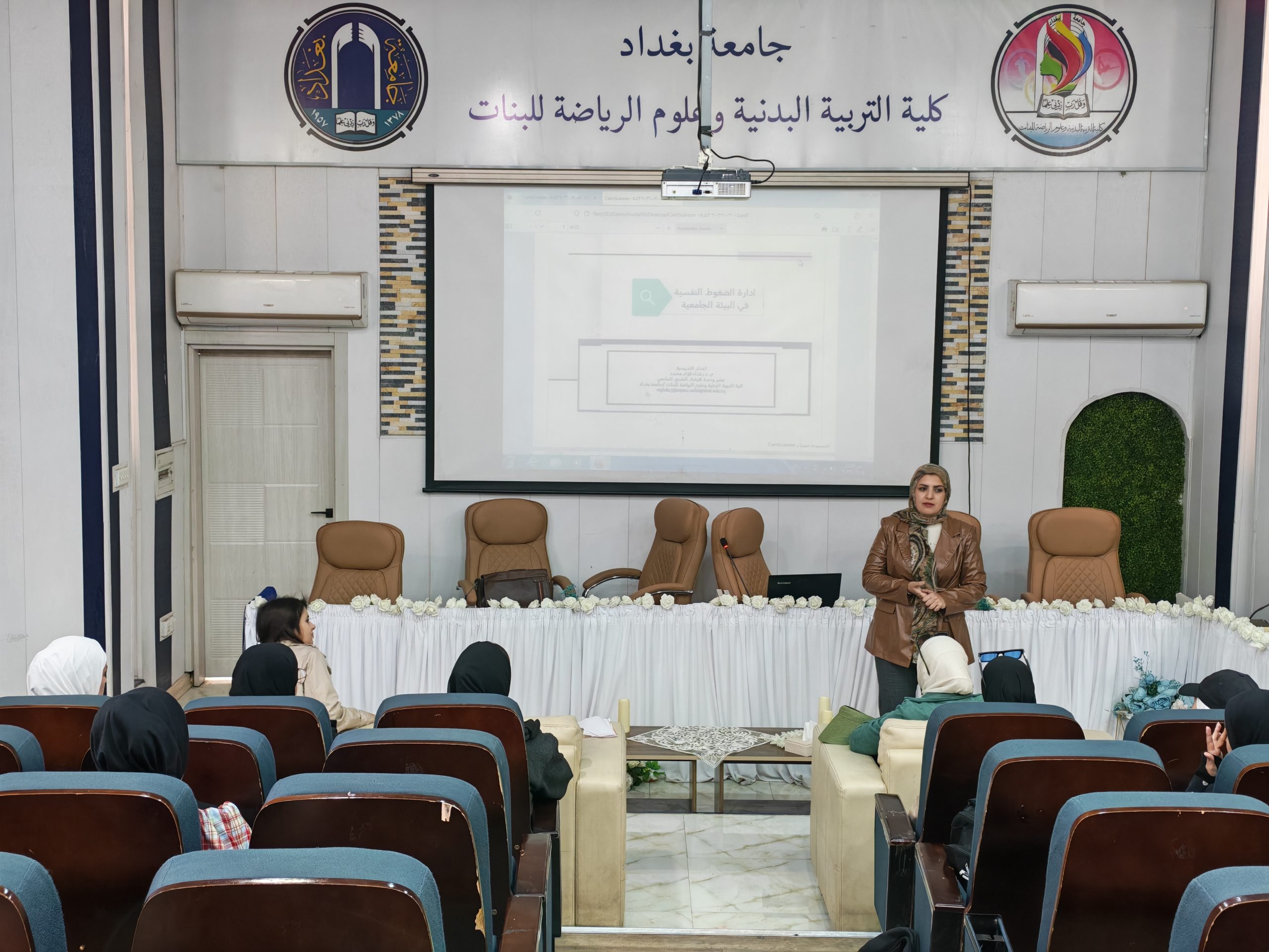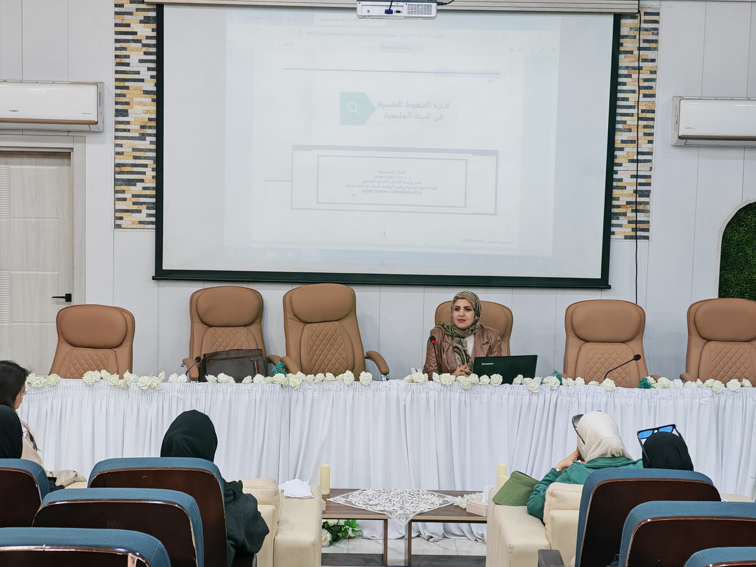 برعاية عمادة الكلية، أقامت وحدة الإرشاد النفسي الجامعي في كلية التربية البدنية وعلوم الرياضة للبنات جامعة بغداد ، ندوة علمية تخصصية بعنوان :”إدارة الضغوط النفسية في البيئة الجامعية”، حاضرت فيها التدريسية في الكلية م.د. رغداء فؤاد محمد ، بحضور مجموعة من طالبات وتدريسيات الكلية .