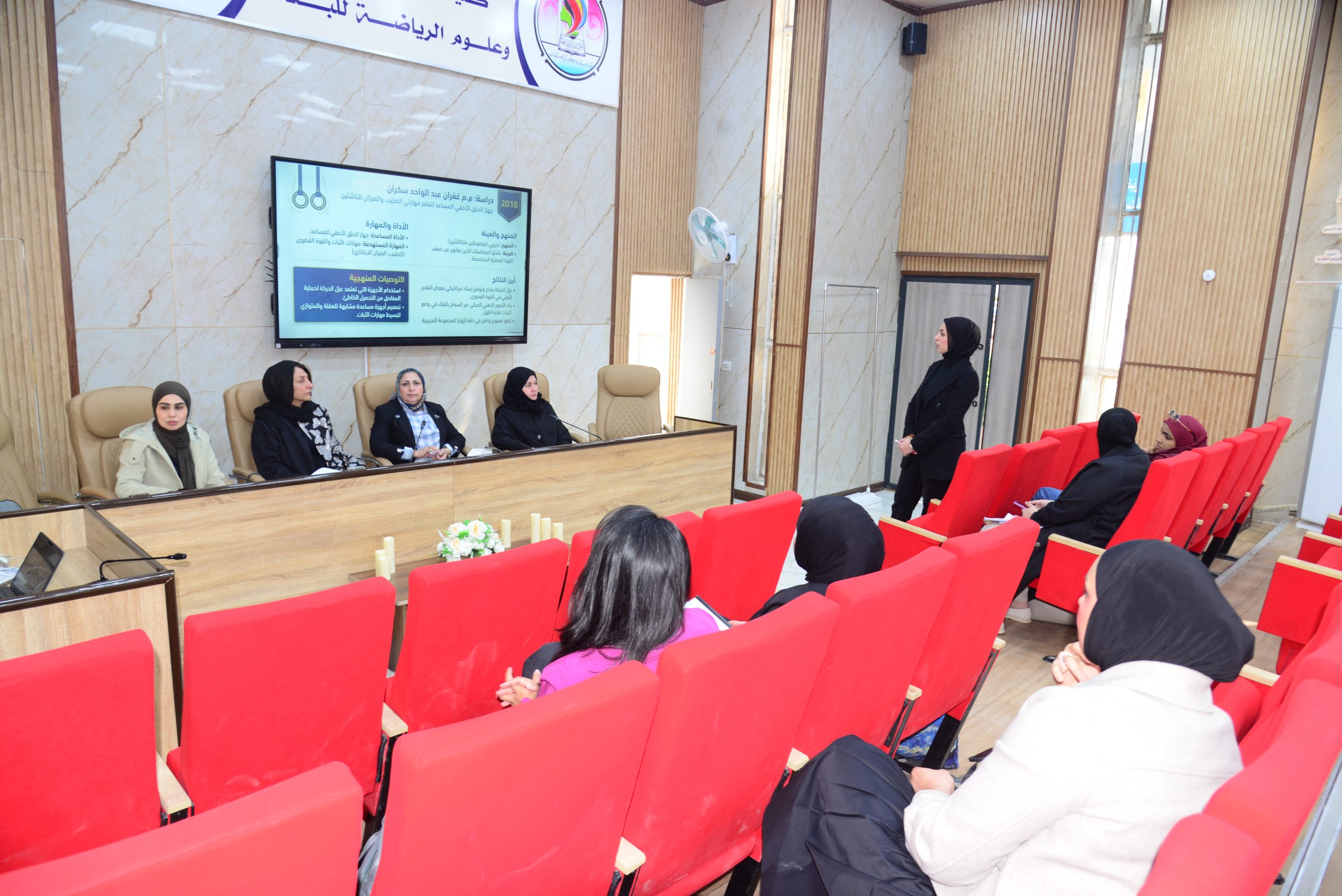 وشهدت الحلقة النقاشية مناقشة مشاريع بحثية لطالبتين من مرحلتي الماجستير والدكتوراه، بحضور لجنة أكاديمية مختصة تألفت من رئيسة اللجنة وأربع عضوات، حيث استعرضت الطالبتان عناوينهما البحثية المقترحة وخطتي العمل، إلى جانب تقديم تحليل نقدي للدراسات السابقة في مجال تخصصهما، بهدف تحديد الفجوات البحثية وتقديم رؤى علمية مبتكرة تسهم في إثراء المكتبة الرياضية.